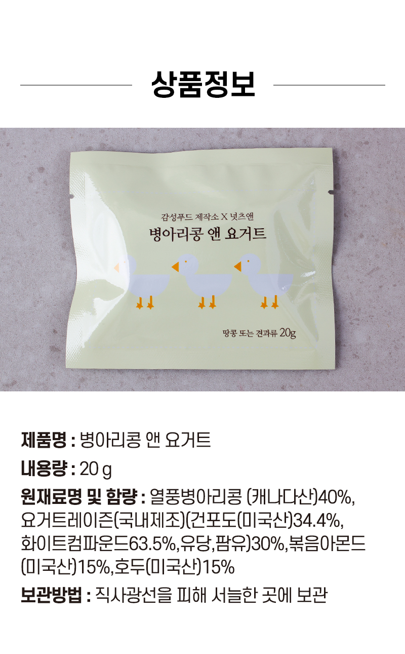 | 포장단위별 내용물의 용량(중량), 수량 | [선물포장] 병아리콩앤요거트 50봉x1박스 / [선물포장] 병아리콩앤요거트 50봉x2박스 |