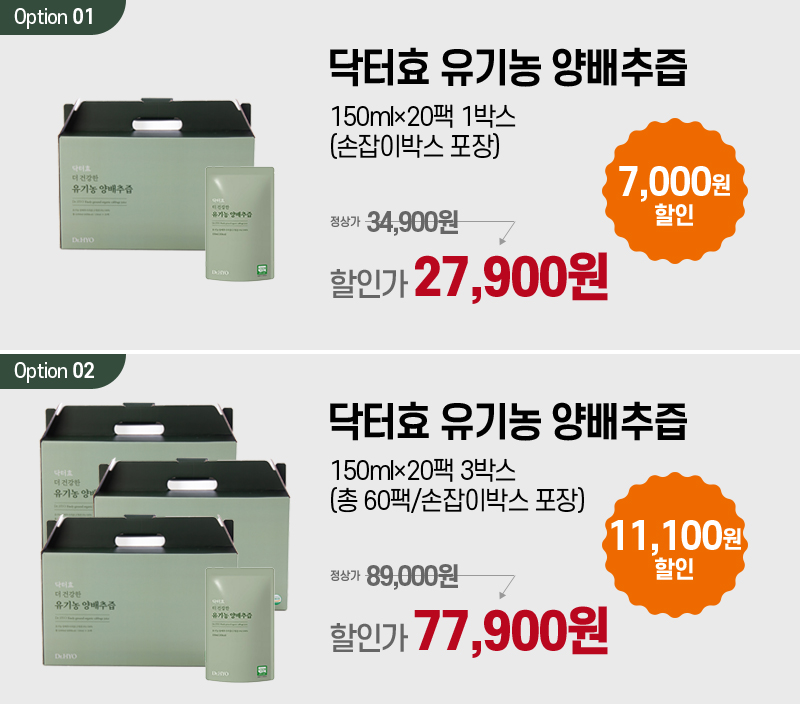 | 포장단위별 내용물의 용량(중량), 수량 | 닥터효 유기농 양배추즙 150ml×20팩 1박스(손잡이박스 포장),닥터효 유기농 양배추즙 150ml×60팩 1박스(실속형 박스) |