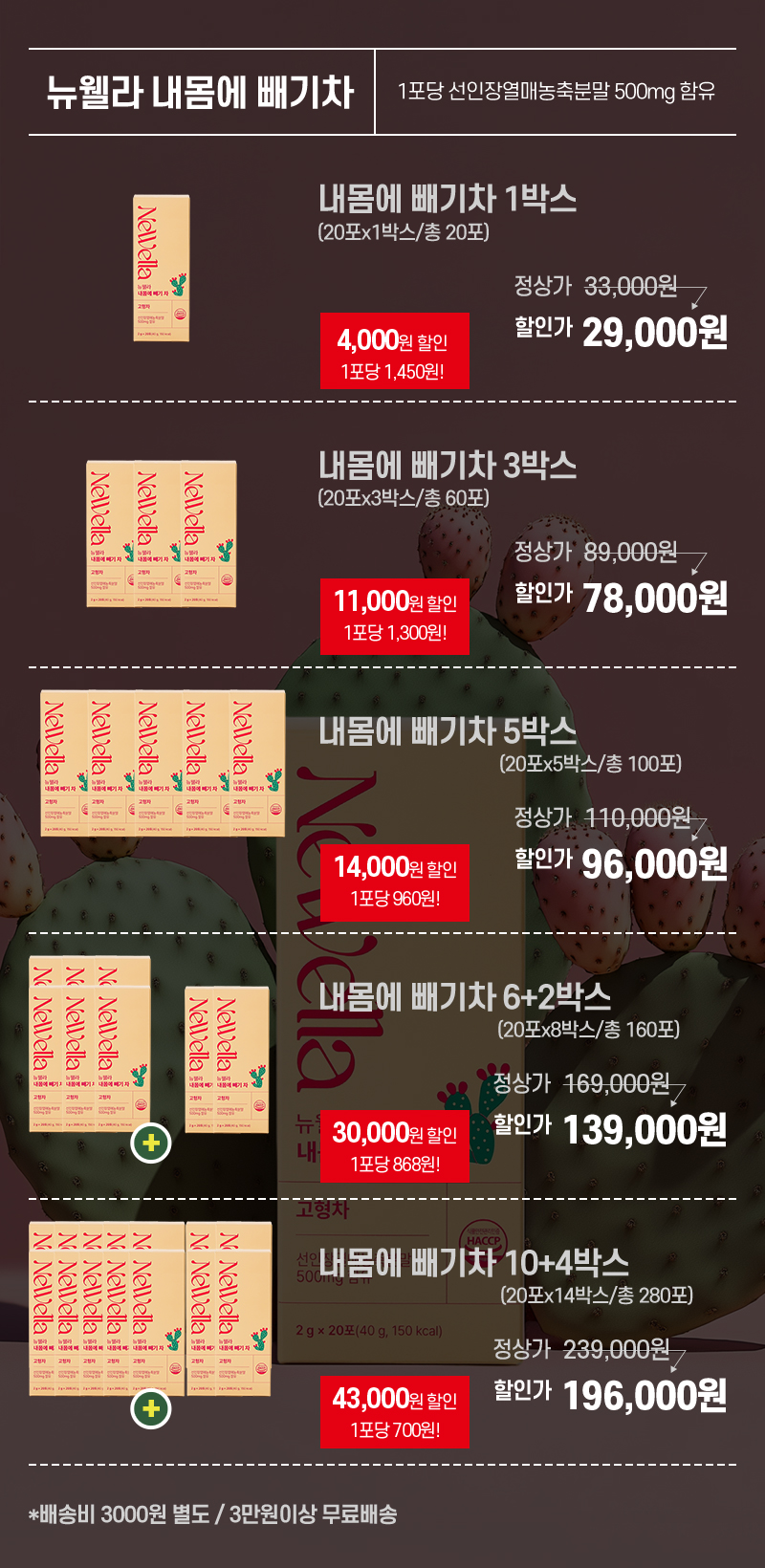 | 제품명 | 뉴웰라 내몸에 빼기차 (1포당 선인장열매농축분말 500mg 함유) |