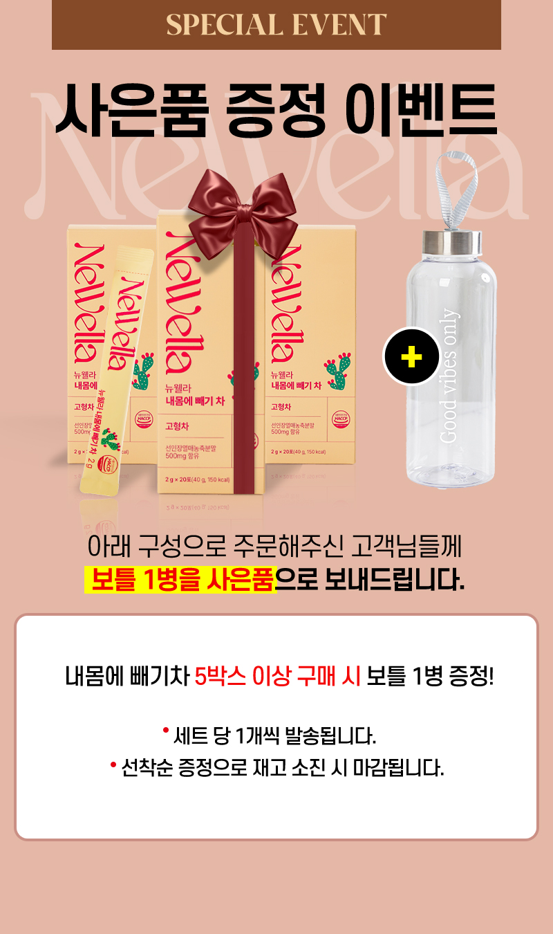 | 포장단위별 내용물의 용량(중량), 수량 | 내몸에 빼기차 1박스(20포x1박스/총 20포) 내몸에 빼기차 3박스(20포x3박스/총 60포) 내몸에 빼기차 5박스(20포x5박스/총 100포)+파우치 증정 내몸에 빼기차 6+2박스(20포x8박스/총 160포)+파우치 증정 내몸에 빼기차 10+4박스(20포x14박스/총 280포)+파우치 증정 |
