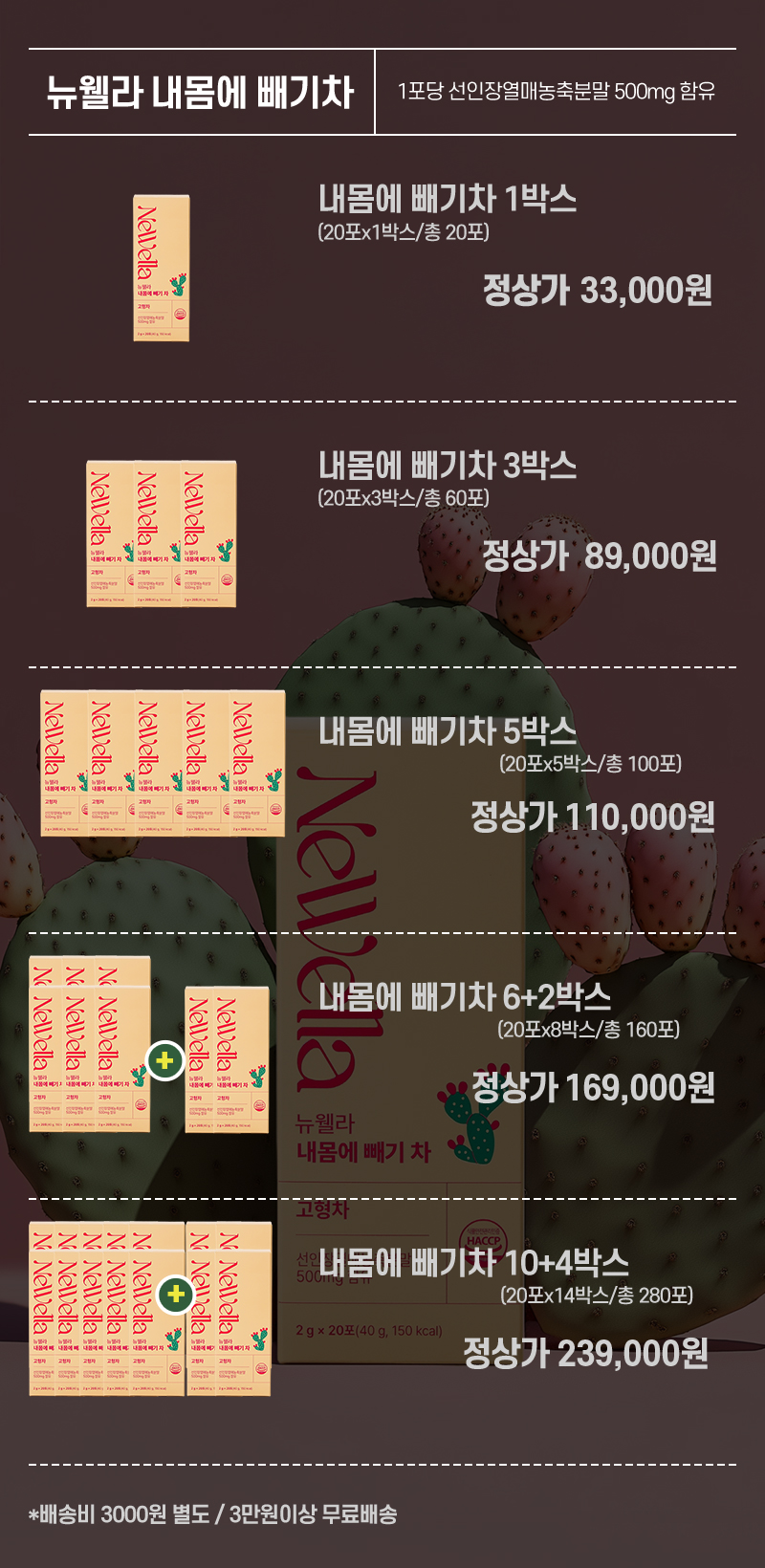 | 제품명 | 뉴웰라 내몸에 빼기차 (1포당 선인장열매농축분말 500mg 함유) |