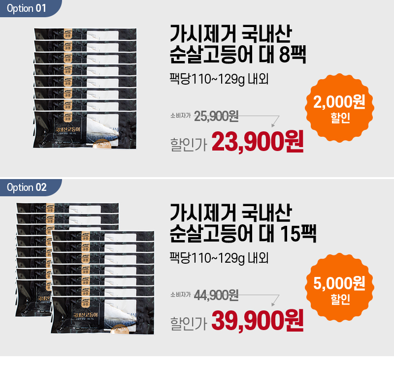 포장단위별 내용물의 용량(중량), 수량 | 가시제거 국내산 순살고등어 대 8팩(팩당110-129g내외) / 가시제거 국내산 순살고등어 대 15팩(팩당110-129g내외) |