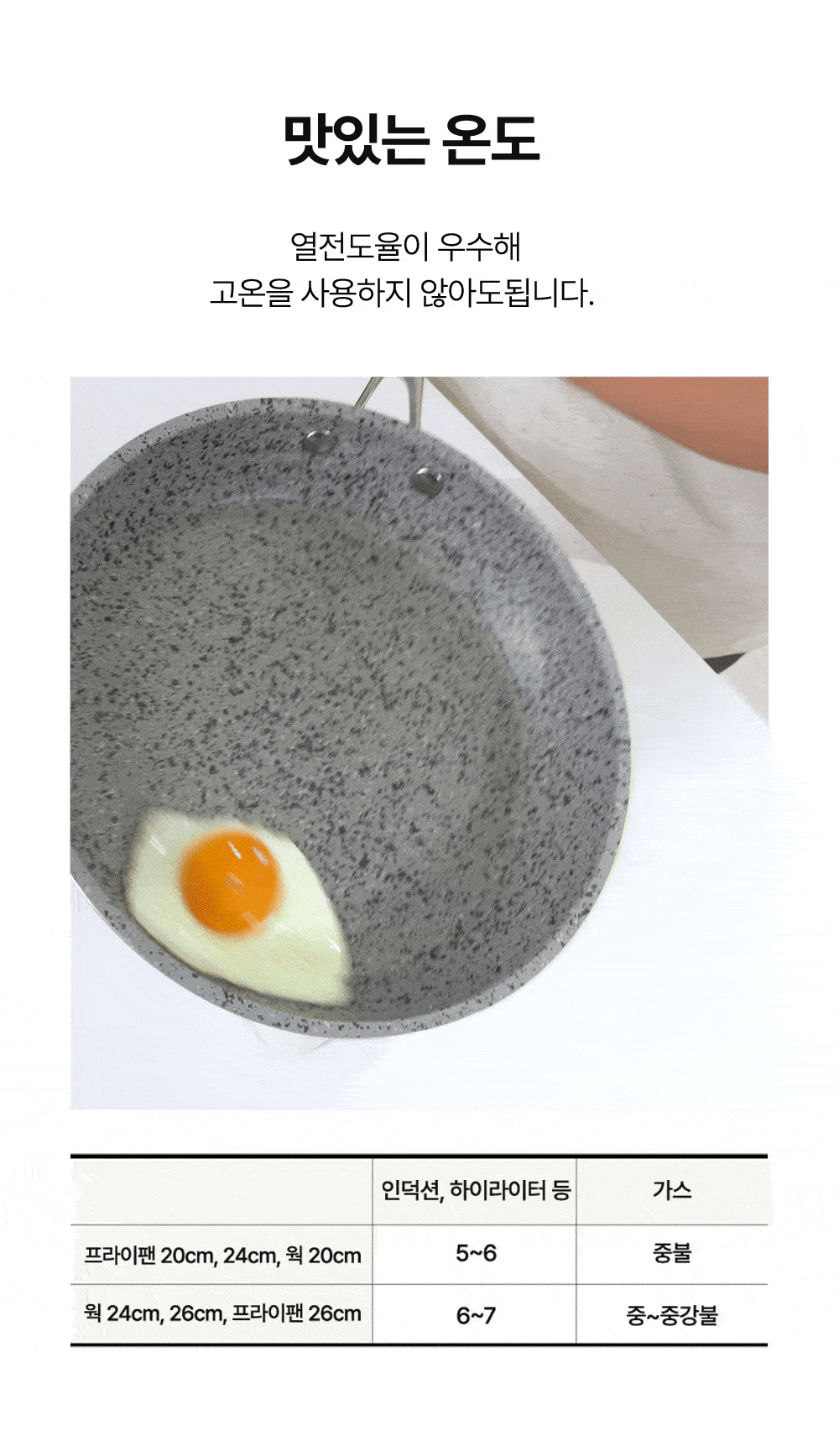 크기 | 20cm프라이팬 무게 700g 높이 50mm 바닥지름 150mm 전체너비 390mm 24cm프라이팬 무게 950g 높이 50mm 바닥지름 190mm 전체너비 4600mm 26cm프라이팬 무게 1050g 높이 50mm 바닥지름 220mm 전체너비 485mm 20cm웍 무게 730g 높이 73mm 바닥지름 145mm 전체너비 385mm 24cm웍 무게 920g 높이 83mm 바닥지름 145mm 전체너비 460mm 26cm웍 무게 1040g 높이 83mm 바닥지름 160mm 전체너비 485mm 24cm사각팬 무게 750g 높이 40mm 세로(내경) 247mm 가로(내경) 213mm 전체너비 465mm 웍커버 20cm ,24cm, 26cm |