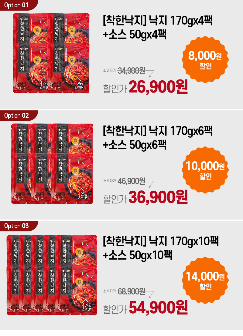 | 포장단위별 내용물의 용량(중량), 수량 | [착한낙지] 낙지 170gx4팩+소스 50gx4팩 / [착한낙지] 낙지 170gx6팩+소스 50gx6팩 / [착한낙지] 낙지 170gx10팩+소스 50gx10팩 |