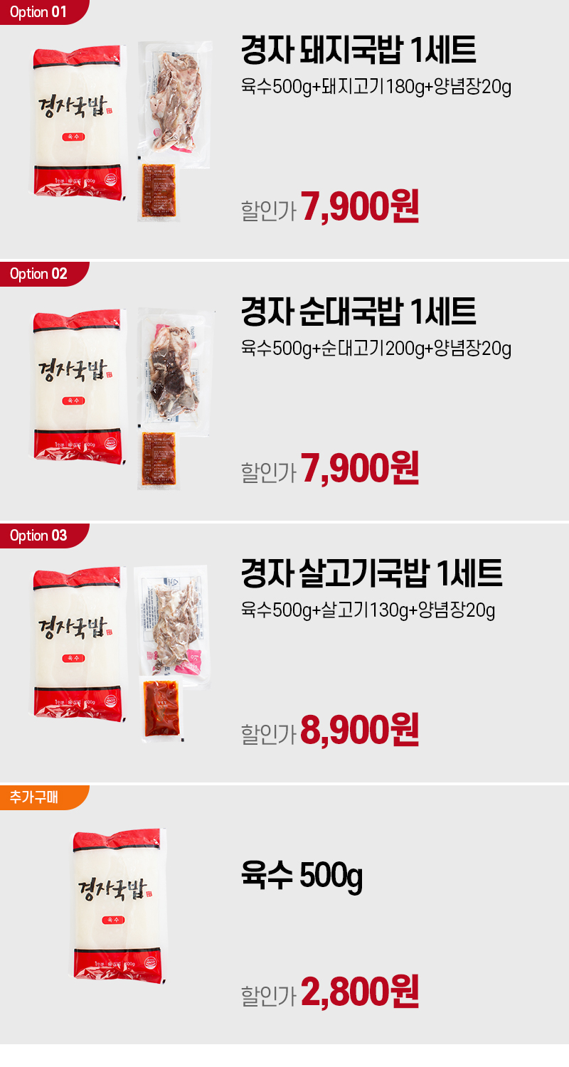 포장단위별 내용물의 용량(중량), 수량 경자 돼지국밥(육수500g+돼지고기180g+양념장20g) / 경자 순대국밥(육수500g+돼지순대200g+양념장20g) / 경자 살고기국밥(육수500g+살고기130g+양념장20g)