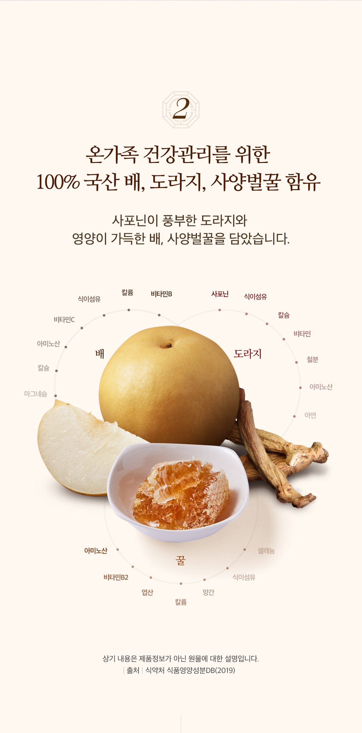 | 원재료명 및 함량 | 정제수, 배농축액(배:국산), 올리고당, 사양벌꿀(국산), 기타가공품{로커스트콩검, 잔탄검, 포도당, 한천(꼬시래기:인도네시아산)_,타마린드검}, 도라지농축액(도라지:국산), 쌍화농축액{작약(국산),황기(국산),당귀(국산),천궁(국산),숙지황(중국산),계피,감초,대추,생강} |