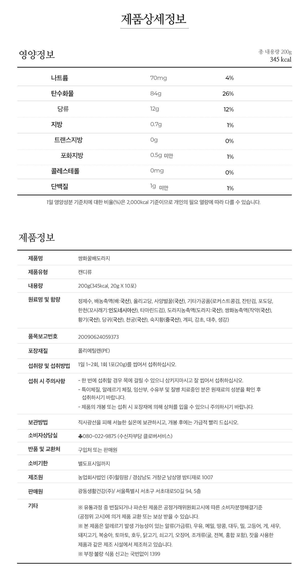 | 포장단위별 내용물의 용량(중량), 수량 | 200g(345kcal, 20gx10포) |