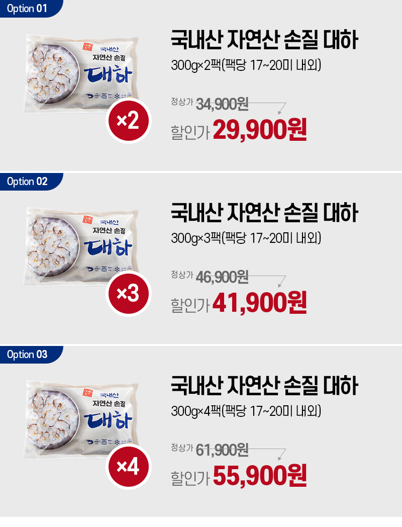 | 상품구성 | 국내산 자연산 손질 대하 300g×2팩,국내산 자연산 손질 대하 300g×3팩,국내산 자연산 손질 대하 300g×4팩 |