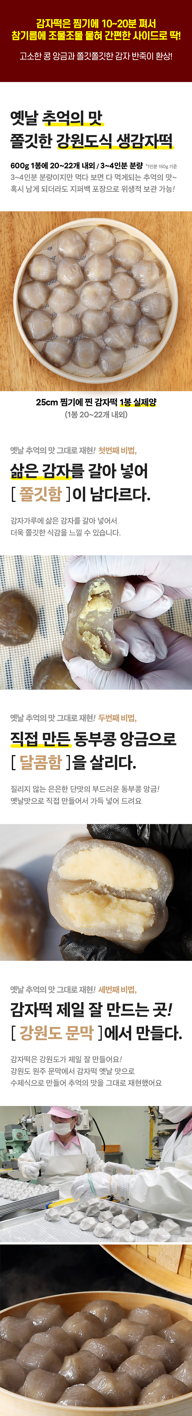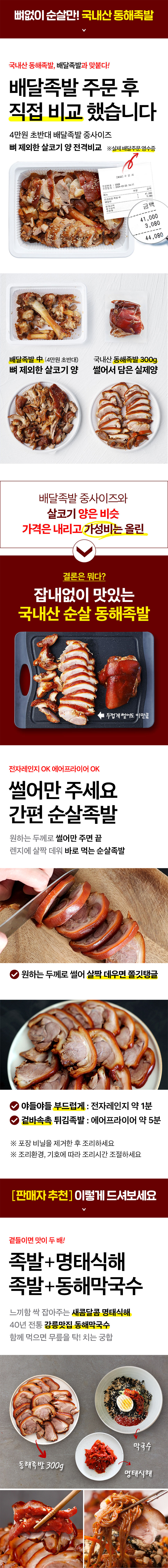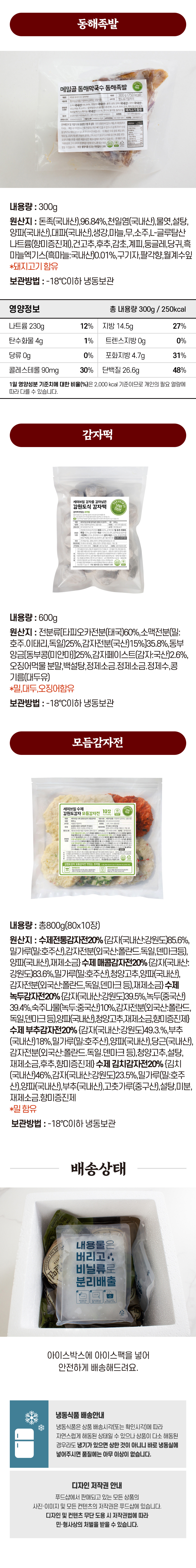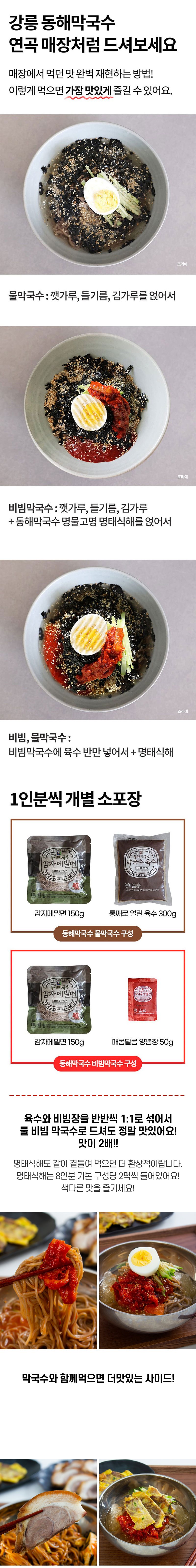 | 포장단위별 내용물의 용량(중량), 수량 | 감자메밀면 내용량:450g 동치미육수 내용량:300g 명태식해 내용량:50g 동해족발 내용량:300g 감자떡 내용량:600g 모듬감자전 내용량:총800g(80x10장) |