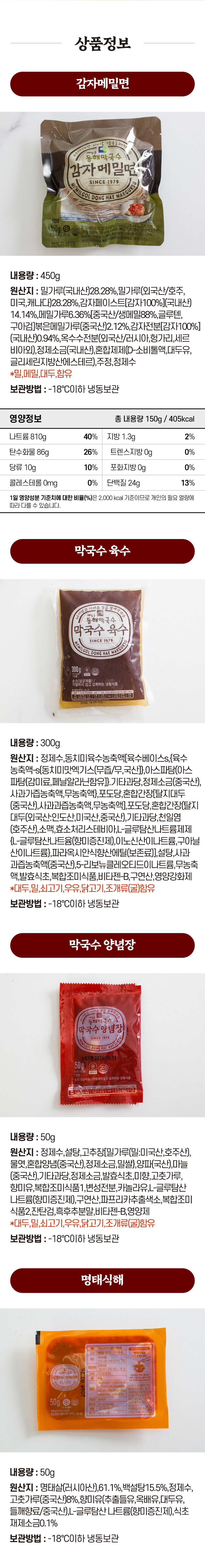 | 제조년월일, 소비기한 또는 품질유지기한 | 막국수면, 비빔장, 육수 - 2025년 7월 제조 순살족발 - 2025년 7월 제조 감자전 - 2025년 5월 제조 감자떡 - 2025년 7월 제조 명태식해 - 2025년 7월 제조 / 전 상품 제조일로부터 냉동보관 1년 |