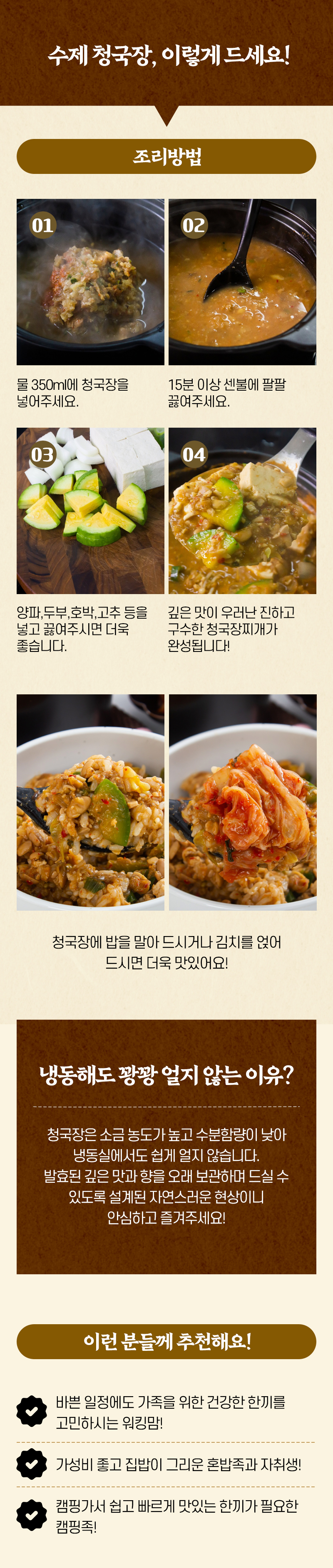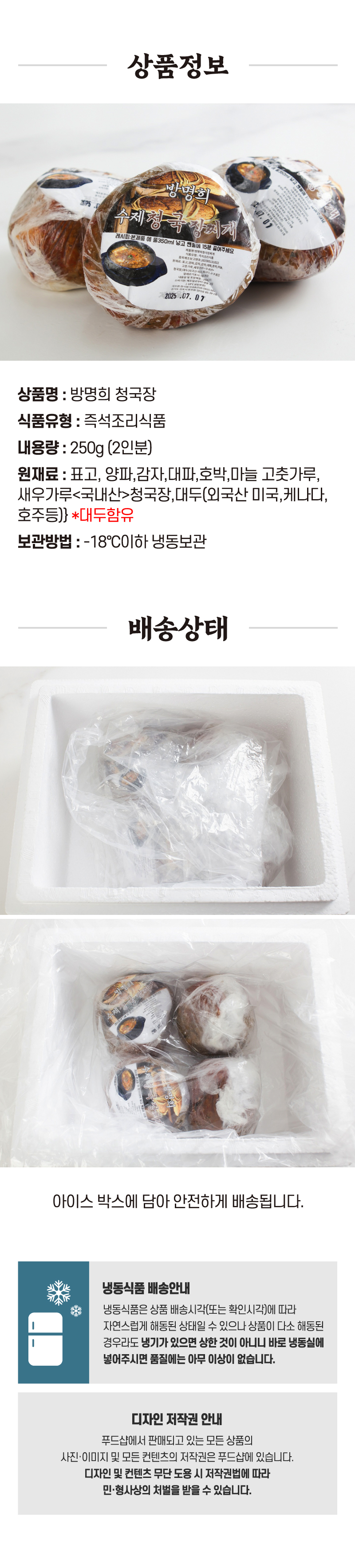 ※ 청국장은 냉동으로 발송되지만 배송도중 자연해동됩니다. 수령 후 바로 냉동보관하시면 품질에는 문제가 없으나, 해동 배송이 불편하신 분께서는 신중한 구매 부탁드립니다.