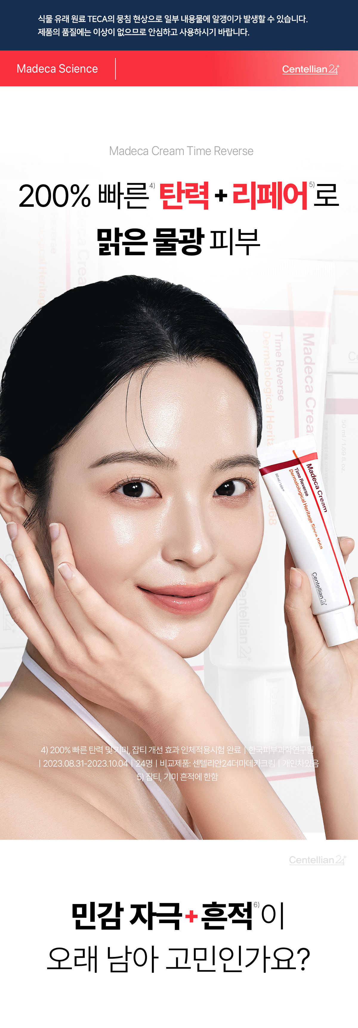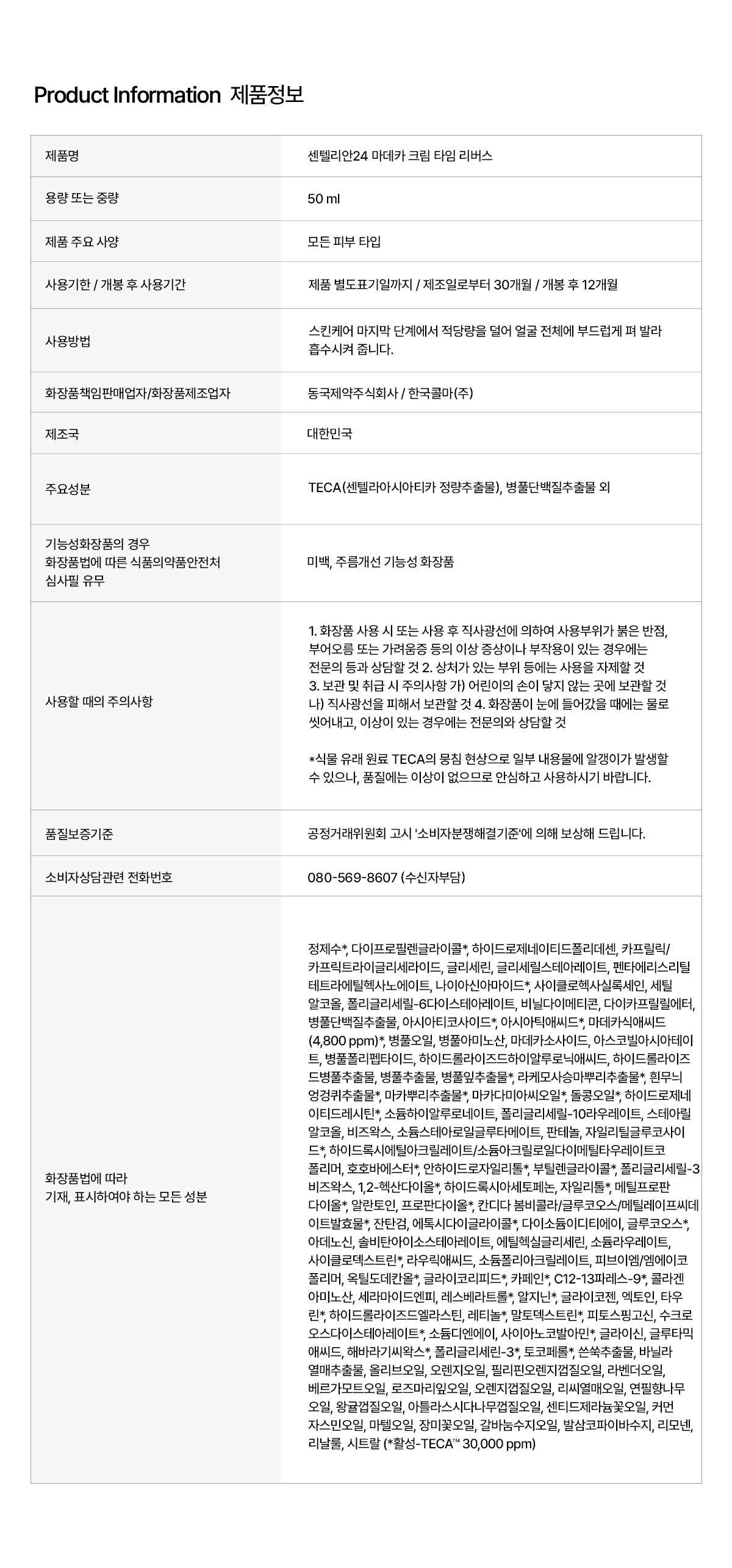 | 모든 원료성분 | 정제수, 다이프로필렌글라이콜, 하이드로제네이티드폴리데센, 카프릴릭/ 카프릭트라이글리세라이드, 글리세린, 글리세릴스테아레이트, 펜타에리스리틸 테트라에틸헥사노에이트, 나이아신아마이드, 사이클로헥사실록세인, 세틸 알코올,폴리글리세릴-6다이스테아레이트, 비닐다이메티콘, 다이카프릴릴에터, 병풀단백질추출물, 아시아티코사이드, 아시아틱애씨드, 마데카식애씨드 (4,800ppm)*, 병풀오일, 병풀아미노산, 마데카소사이드, 아스코빌아시아테이 트, 병풀폴리펩타이드, 하이드롤라이즈드하이알루로닉애씨드, 하이드롤라이즈 드병풀추출물, 병풀추출물, 병풀잎추출물, 라케모사승마뿌리추출물, 흰무늬 엉겅퀴추출물, 마카뿌리추출물, 마카다미아씨오일*, 돌콩오일, 하이드로제네 이티드레시틴, 소듐하이알루로네이트, 폴리글리세릴-10라우레이트, 스테아릴 알코올, 비즈왁스, 소듐스테아로일글루타메이트, 판테놀, 자일리틸글루코사이 드, 하이드록시에틸아크릴레이트/소듐아크릴로일다이메틸타우레이트코 폴리머,호호바에스터, 안하이드로자일리톨, 부틸렌글라이콜, 폴리글리세릴-3 비즈왁스, 1,2-헥산다이올, 하이드록시아세토페논, 자일리톨*, 메틸프로판 다이올, 알란토인, 프로판다이올, 칸디다 봄비콜라/글루코오스/메틸레이프씨데 이트발효물, 잔탄검, 에톡시다이글라이콜, 다이소듐이디티에이, 글루코오스*, 아데노신, 솔비탄이소스테아레이트, 에틸헥실글리세린, 소듐라우레이트, 사이클로덱스트린, 라우릭애씨드, 소듐폴리아크릴레이트, 피브이엠/엠에이코 폴리머,옥틸도데칸올, 글라이코리피드, 카페인, C12-13파레스-9*, 콜라겐 아미노산,세라마이드엔피, 레스베라트롤*, 알지닌, 글라이코젠, 엑토인, 타우 린, 하이드롤라이즈드엘라스틴, 레티놀*, 말토덱스트린, 피토스핑고신, 수크로 오스다이스테아레이트, 소듐디엔에이, 사이아노코발아민, 글라이신, 글루타믹 애씨드, 해바라기씨왁스, 폴리글리세린-3*, 토코페롤, 쓴쑥추출물, 바닐라 열매추출물,올리브오일, 오렌지오일, 필리핀오렌지껍질오일, 라벤더오일, 베르가모트오일, 로즈마리잎오일, 오렌지껍질오일, 리씨열매오일, 연필향나무 오일, 왕귤껍질오일, 아틀라스시다나무껍질오일, 센티드제라늄꽃오일, 커먼 자스민오일, 마텔오일, 장미꽃오일, 갈바눔수지오일, 발삼코파이바지, 리모넨, 리날룰, 시트랄(*활성-TECATM 30,000 ppm) |