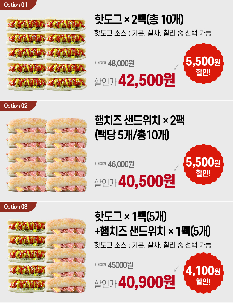 | 포장단위별 내용물의 용량(중량), 수량 | 핫도그 1팩 : 185g×5개 / 햄치즈 샌드위치 1팩 : 163g×5개 |