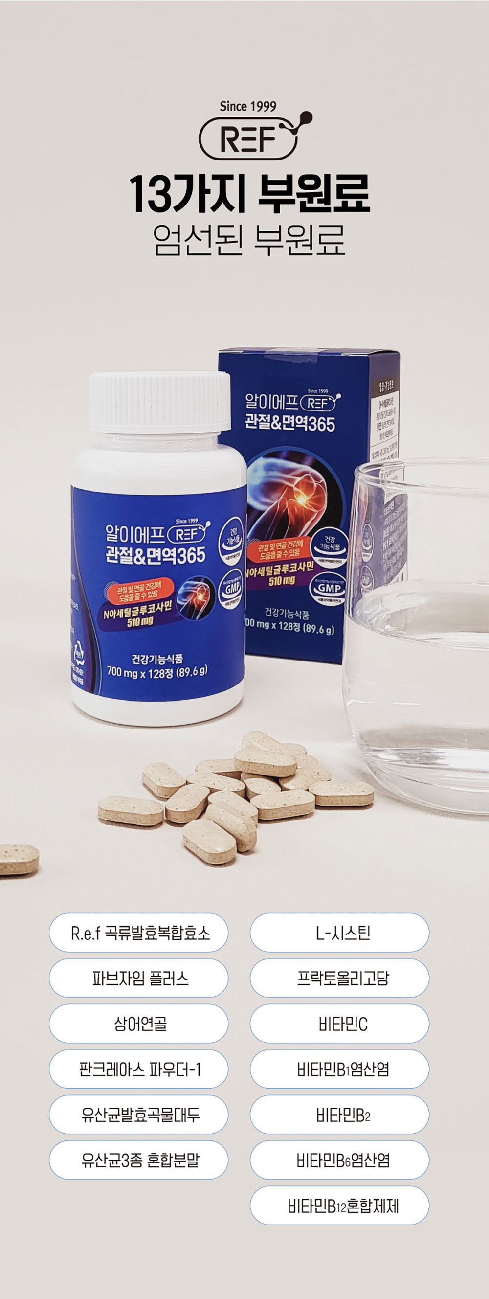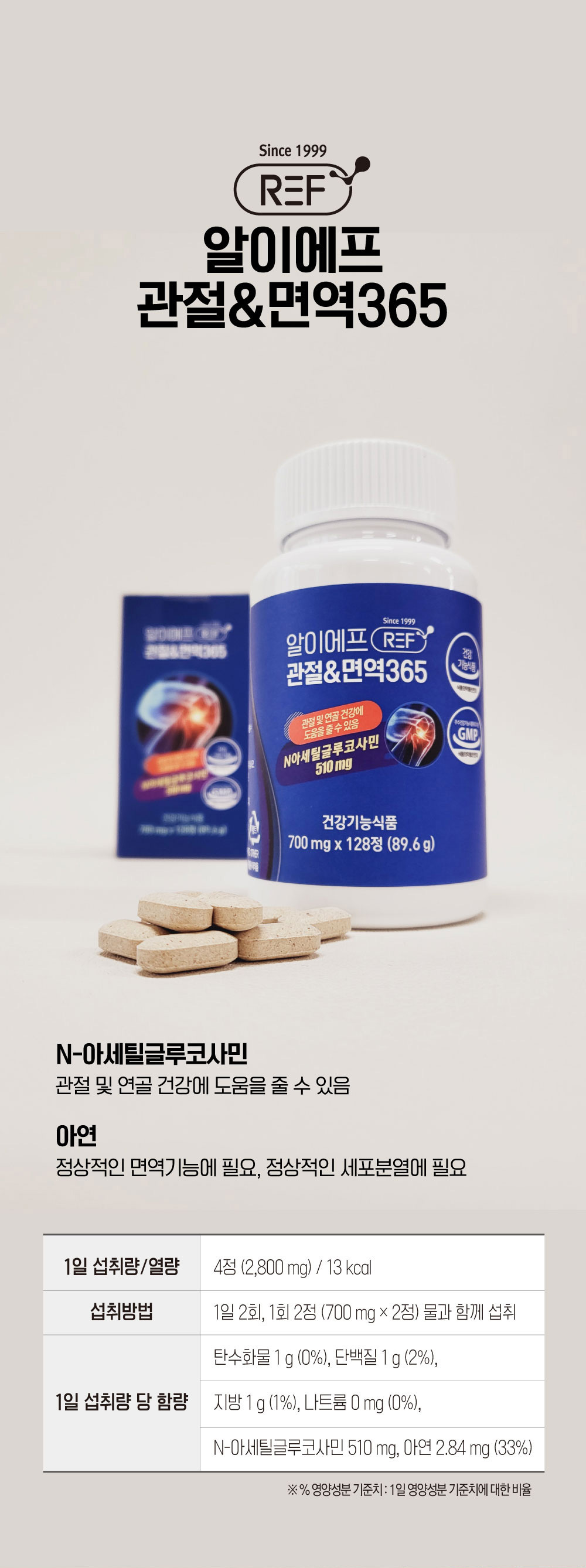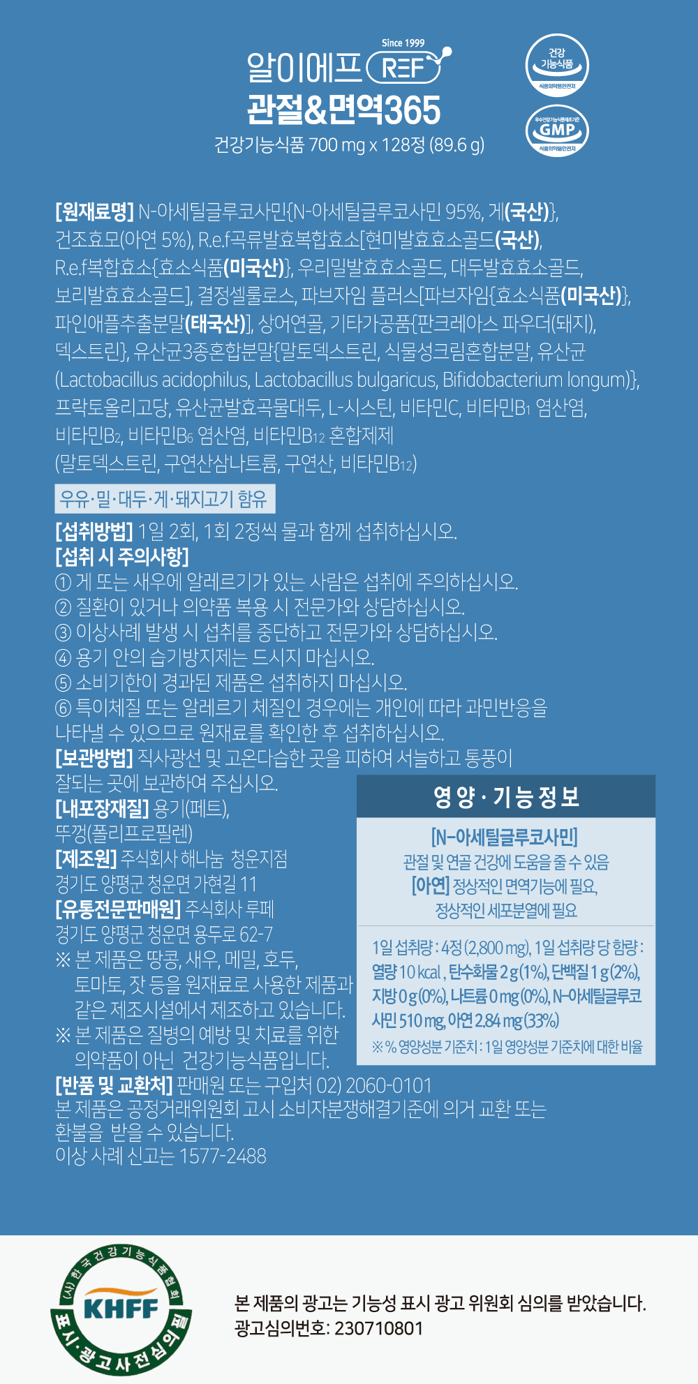 | 원료명 및 함량 | N-아세틸글루코사민{N-아세틸글루코사민 95%, 게(국산)}, 건조효모(아연 5%), R.e.f곡류발효복합효소{현미발효효소골드(국산), 대두발효효소골드(국산), 보리발효효소골드}, 결정셀룰로스, 파브자임-2(브로멜라인, 파파인), 상어연골(뉴질랜드), 판크레아틴-1(판크레아틴, 덱스트린), 히드록시프로필메틸셀룰로스, 유산균발효곡물대두, 유산균3종혼합분말{말토덱스트린, 식물성분말크림, 유산균(Lactobacillus acidophilus, Lactobacillus bulgaricus, Bifidobacterium longum)}, L-시스틴, 프락토올리고당, 비타민C, 이산화규소, 카복시메틸셀룰로스칼슘, 스테아린산마그네슘, 비타민B1염산염, 비타민B2, 비타민B6염산염, 비타민B12혼합제제(말토덱스트린, 구연산삼나트륨, 구연산, 비타민B12) |