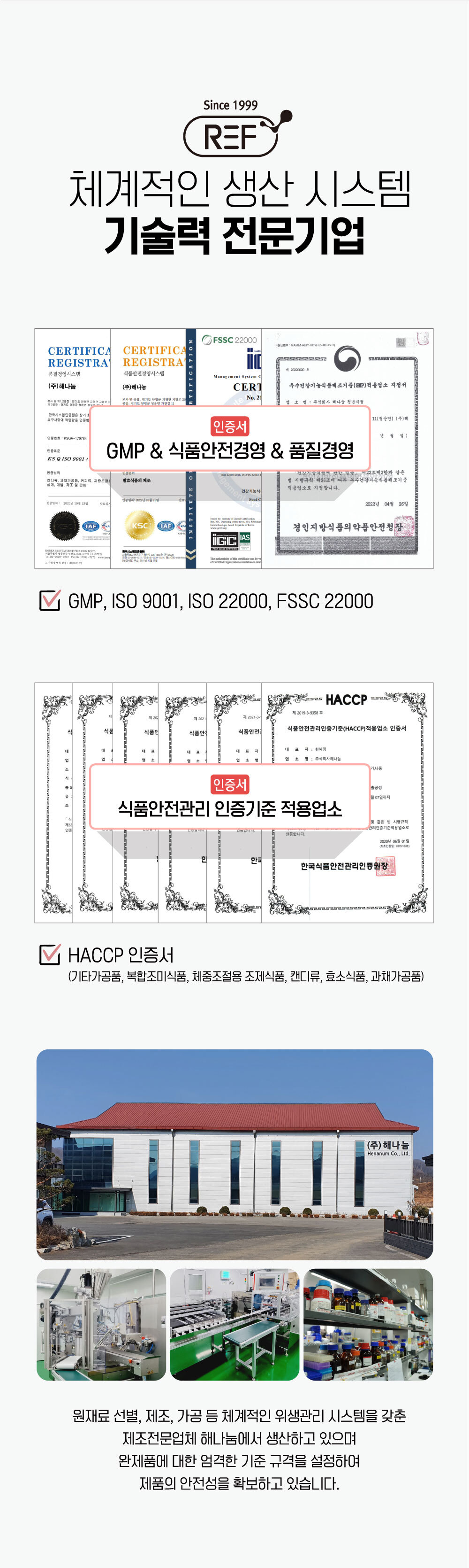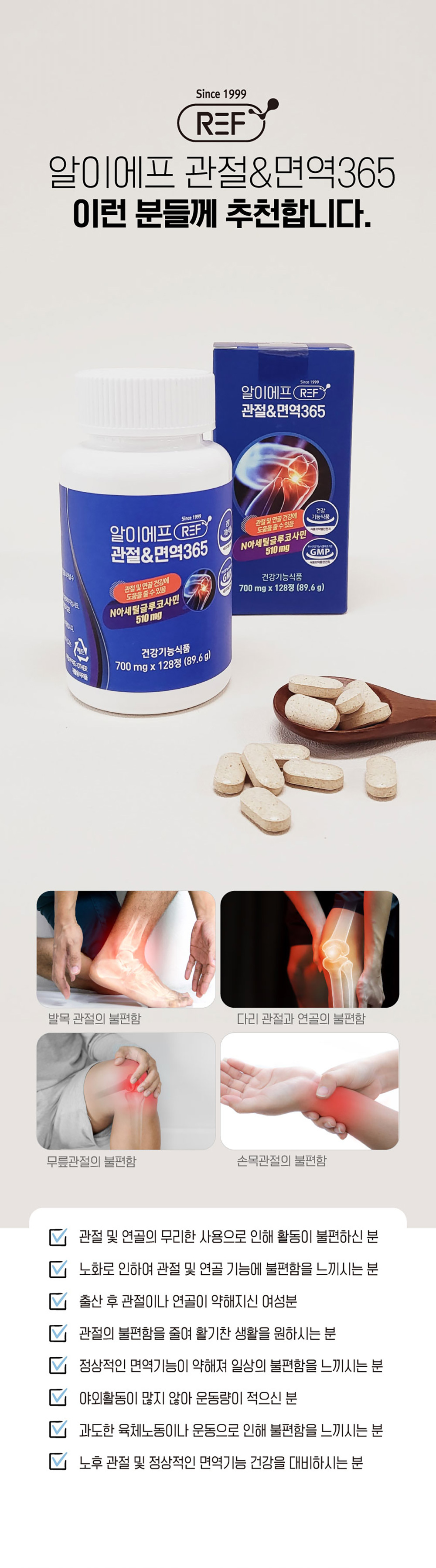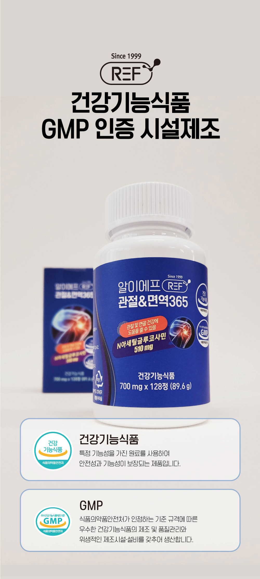 | 원료명 및 함량 | N-아세틸글루코사민{N-아세틸글루코사민 95%, 게(국산)}, 건조효모(아연 5%), R.e.f곡류발효복합효소{현미발효효소골드(국산), 대두발효효소골드(국산), 보리발효효소골드}, 결정셀룰로스, 파브자임-2(브로멜라인, 파파인), 상어연골(뉴질랜드), 판크레아틴-1(판크레아틴, 덱스트린), 히드록시프로필메틸셀룰로스, 유산균발효곡물대두, 유산균3종혼합분말{말토덱스트린, 식물성분말크림, 유산균(Lactobacillus acidophilus, Lactobacillus bulgaricus, Bifidobacterium longum)}, L-시스틴, 프락토올리고당, 비타민C, 이산화규소, 카복시메틸셀룰로스칼슘, 스테아린산마그네슘, 비타민B1염산염, 비타민B2, 비타민B6염산염, 비타민B12혼합제제(말토덱스트린, 구연산삼나트륨, 구연산, 비타민B12) |