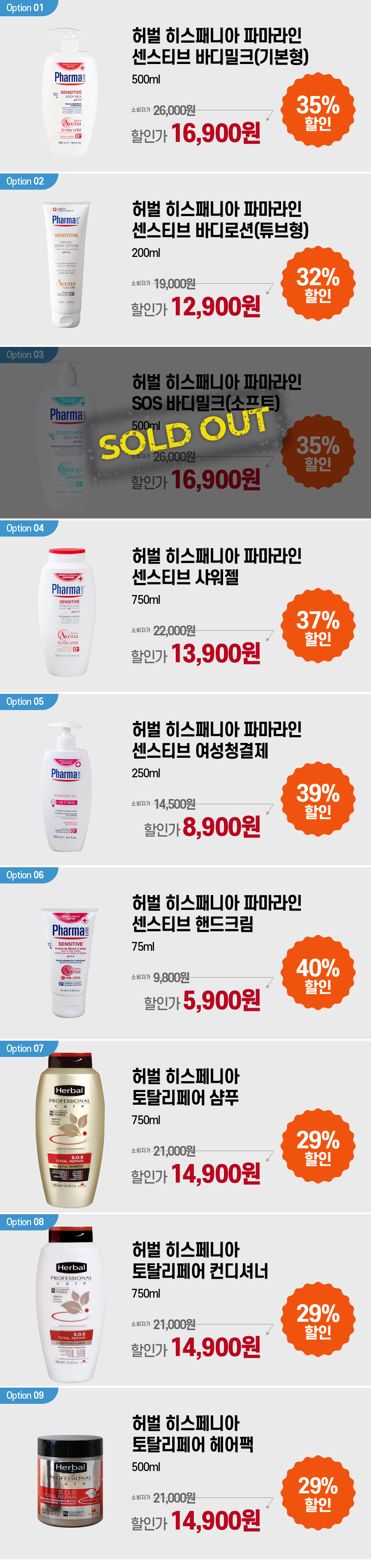 | 내용물의 용량 또는 중량 | 파마라인 센스티브 바디밀크(기본형) 500mll 파마라인 센스티브 바디로션(튜브형) 200ml 파마라인 센스티브 더마톨로직 샤워젤 750ml 파마라인 센스티브 여성청결제 250ml 파마라인 센스티브 핸드크림 75ml 허벌 히스패니아 토탈리페어 샴푸 750ml 허벌 히스패니아 토탈리페어 컨디셔너 750ml 허벌 히스페니아 토탈리페어 헤어팩 500ml |