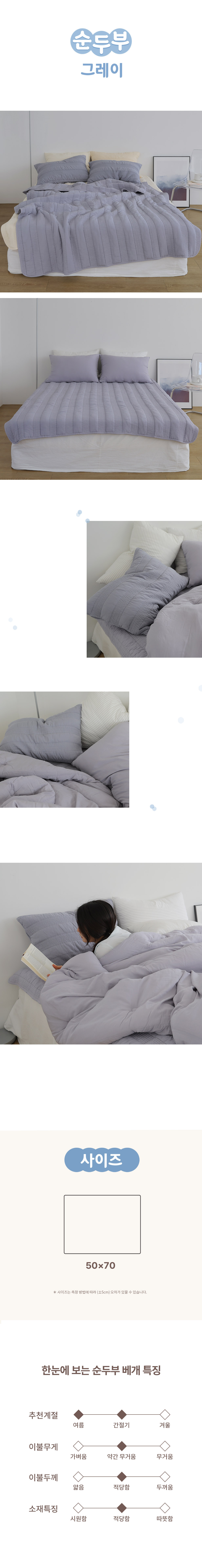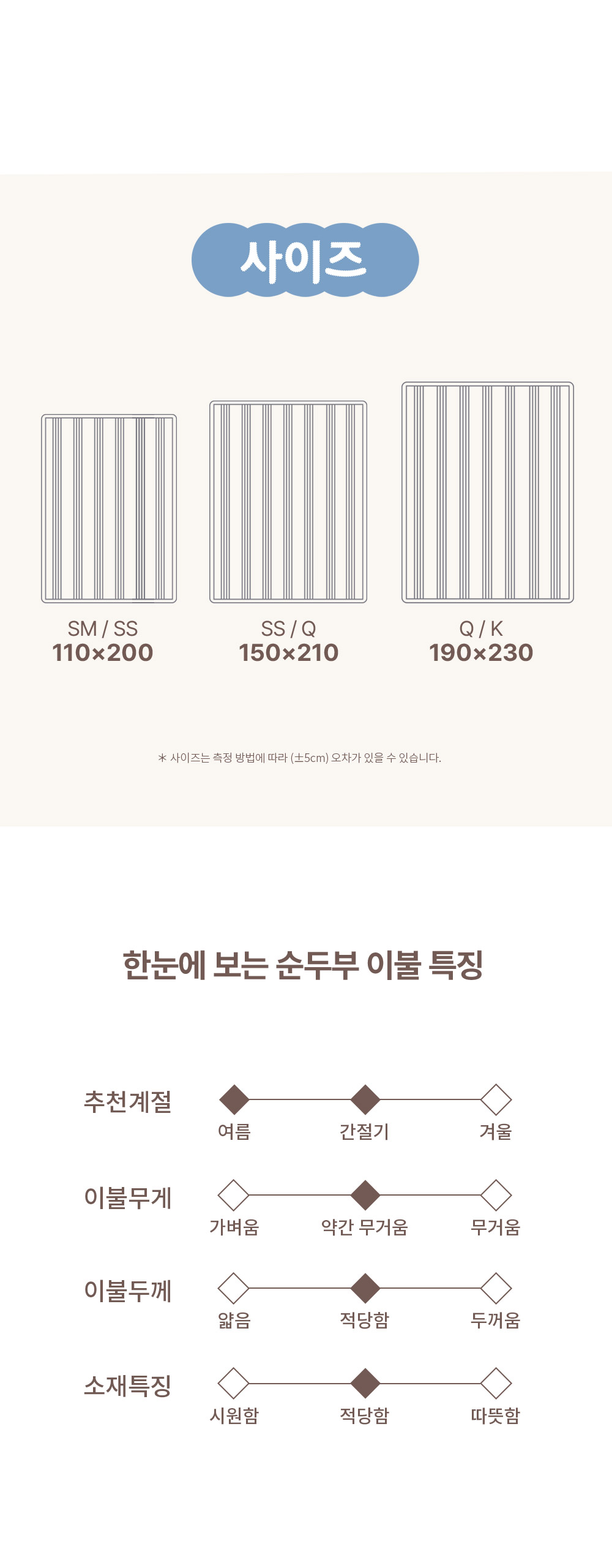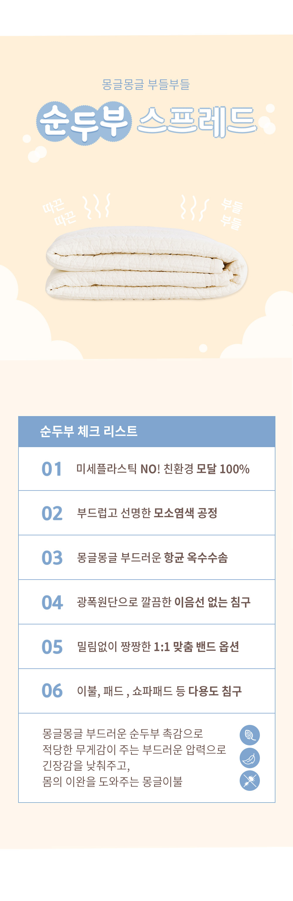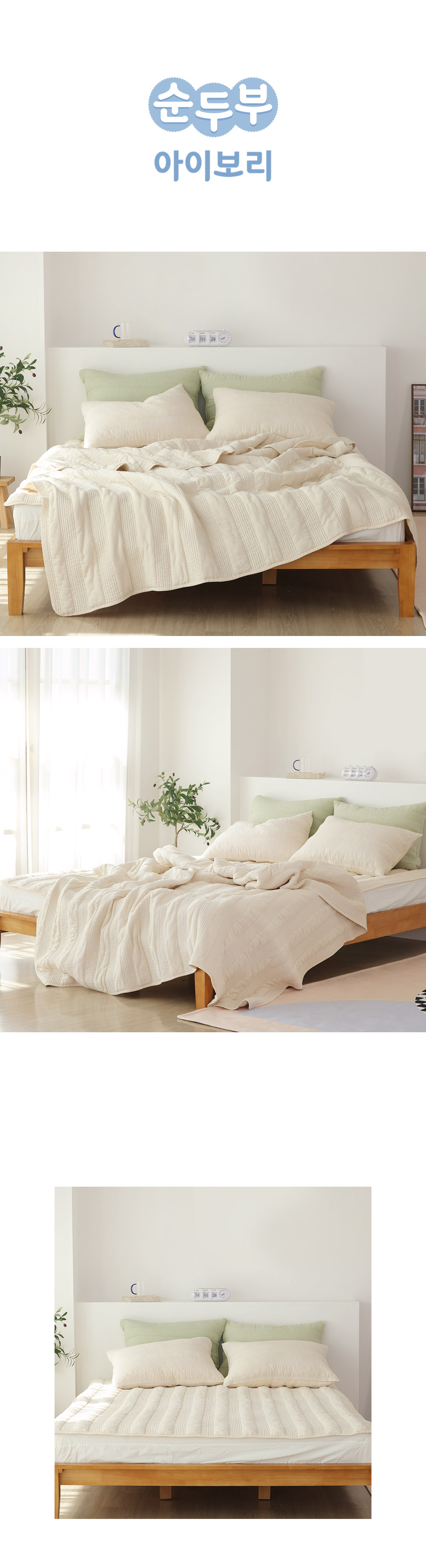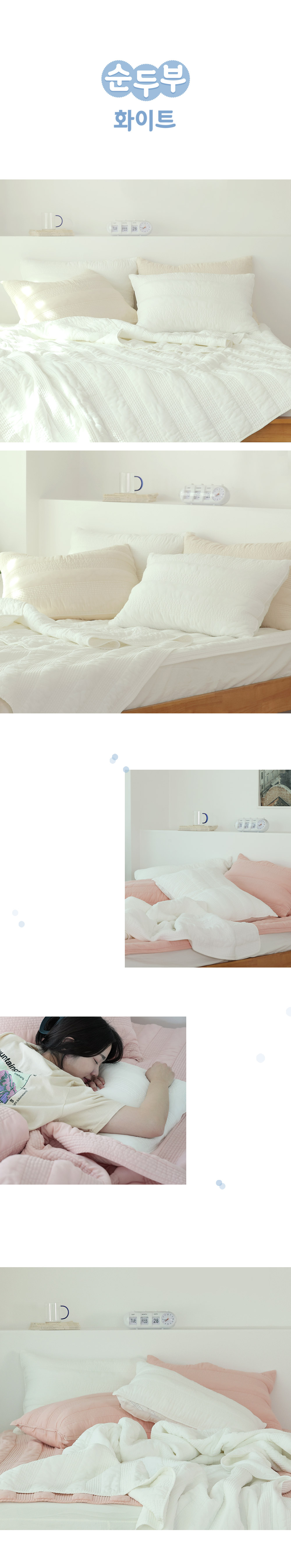 | 치수 | 순두부 스프레드 이불 SM/SS (110cm*200cm/1kg) 순두부 스프레드 이불 SS/Q (150cm*210cm/1.65kg) 순두부 스프레드 이불 Q/K (190cm*230cm/2.32kg) 순두부 스프레드 이불 SM/SS (패드용 밴드추가) (110cm*200cm/1kg) 순두부 스프레드 이불 SS/Q (패드용 밴드추가) (150cm*210cm/1.65kg) 순두부 스프레드 이불 Q/K (패드용 밴드추가) (190cm*230cm/2.32kg) 순두부 스프레드 베개커버 (50cm*70cm) |
