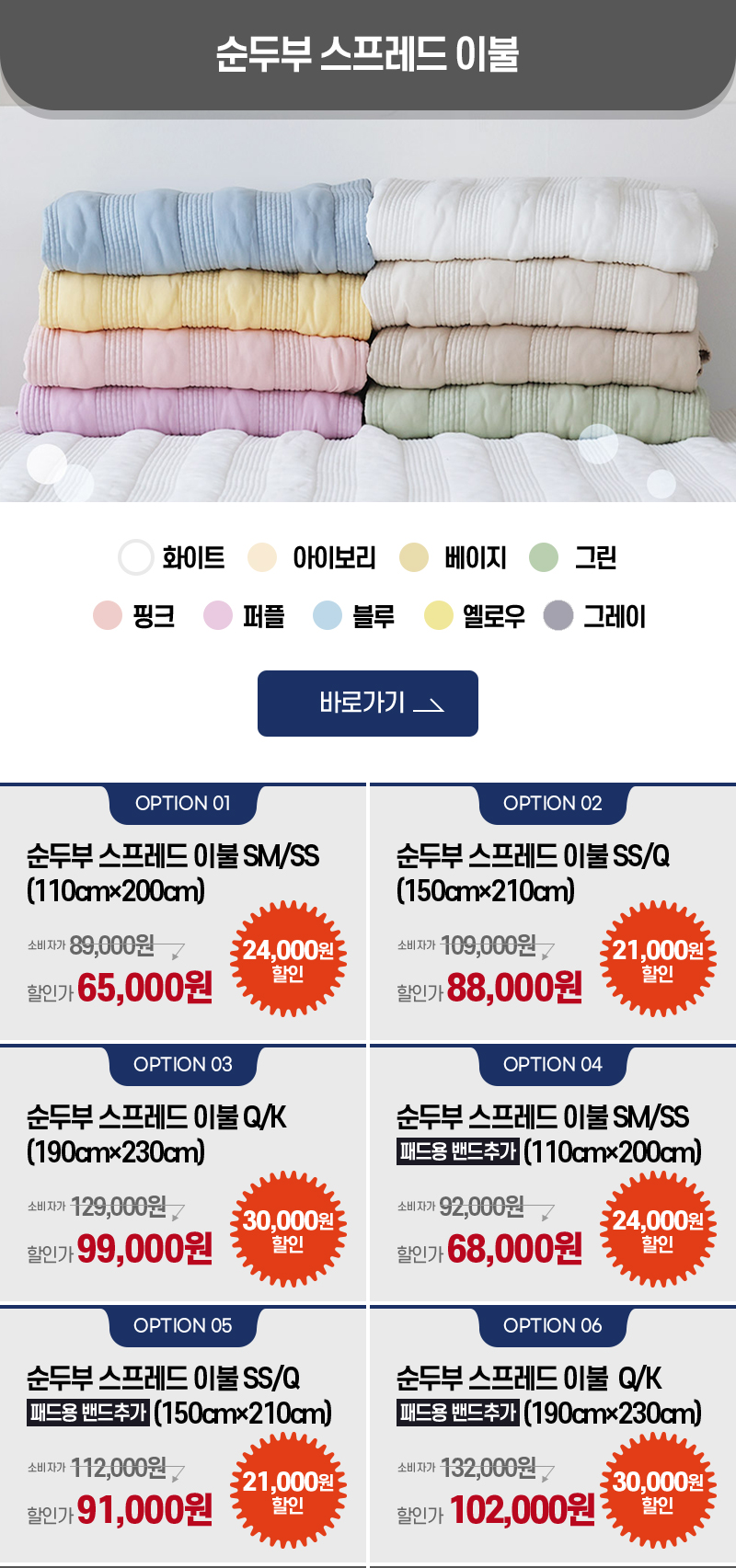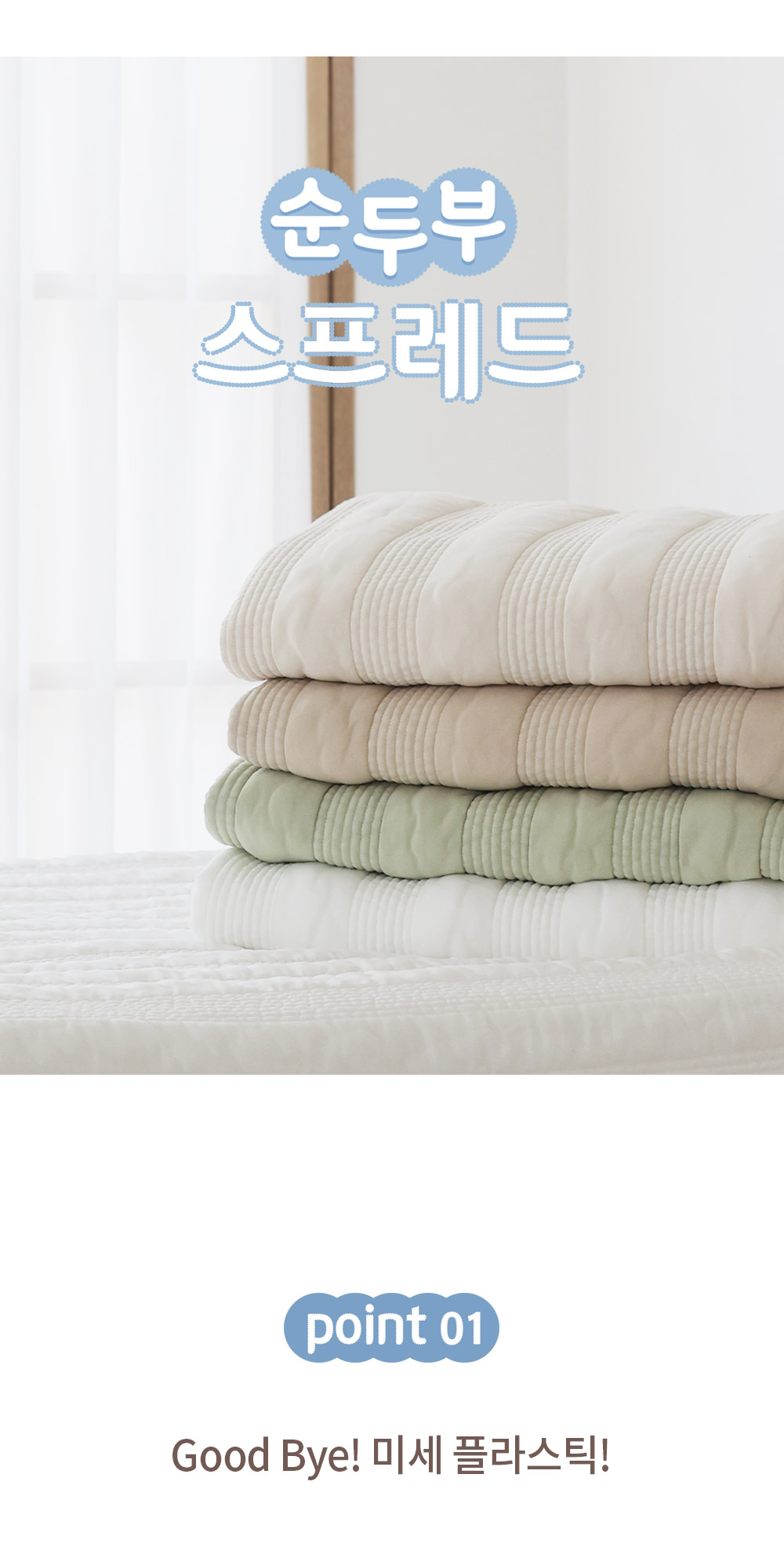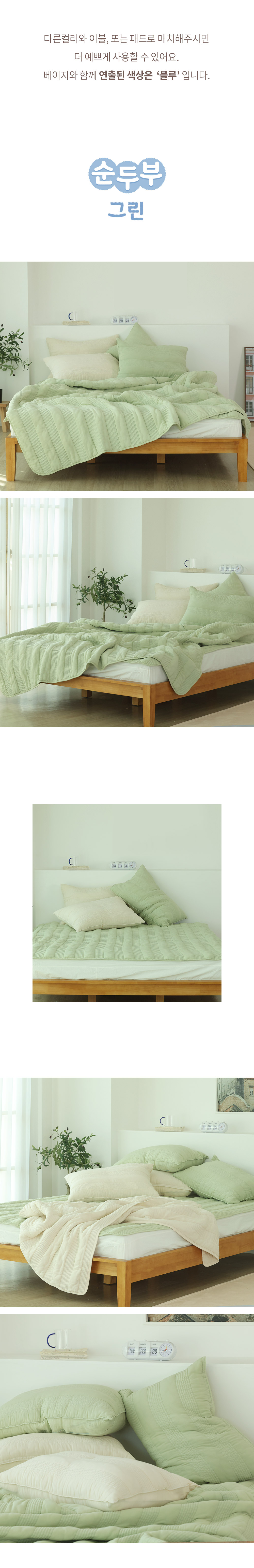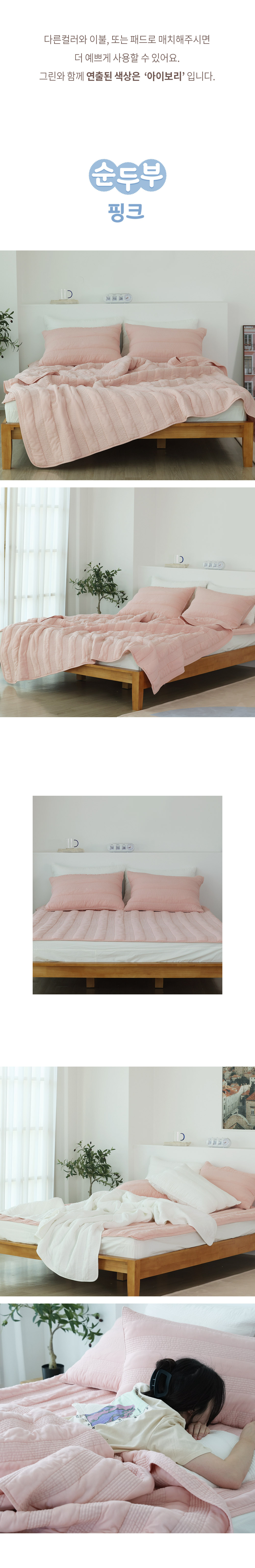 | 치수 | 순두부 스프레드 이불 SM/SS (110cm*200cm/1kg) 순두부 스프레드 이불 SS/Q (150cm*210cm/1.65kg) 순두부 스프레드 이불 Q/K (190cm*230cm/2.32kg) 순두부 스프레드 이불 SM/SS (패드용 밴드추가) (110cm*200cm/1kg) 순두부 스프레드 이불 SS/Q (패드용 밴드추가) (150cm*210cm/1.65kg) 순두부 스프레드 이불 Q/K (패드용 밴드추가) (190cm*230cm/2.32kg) 순두부 스프레드 베개커버 (50cm*70cm) |