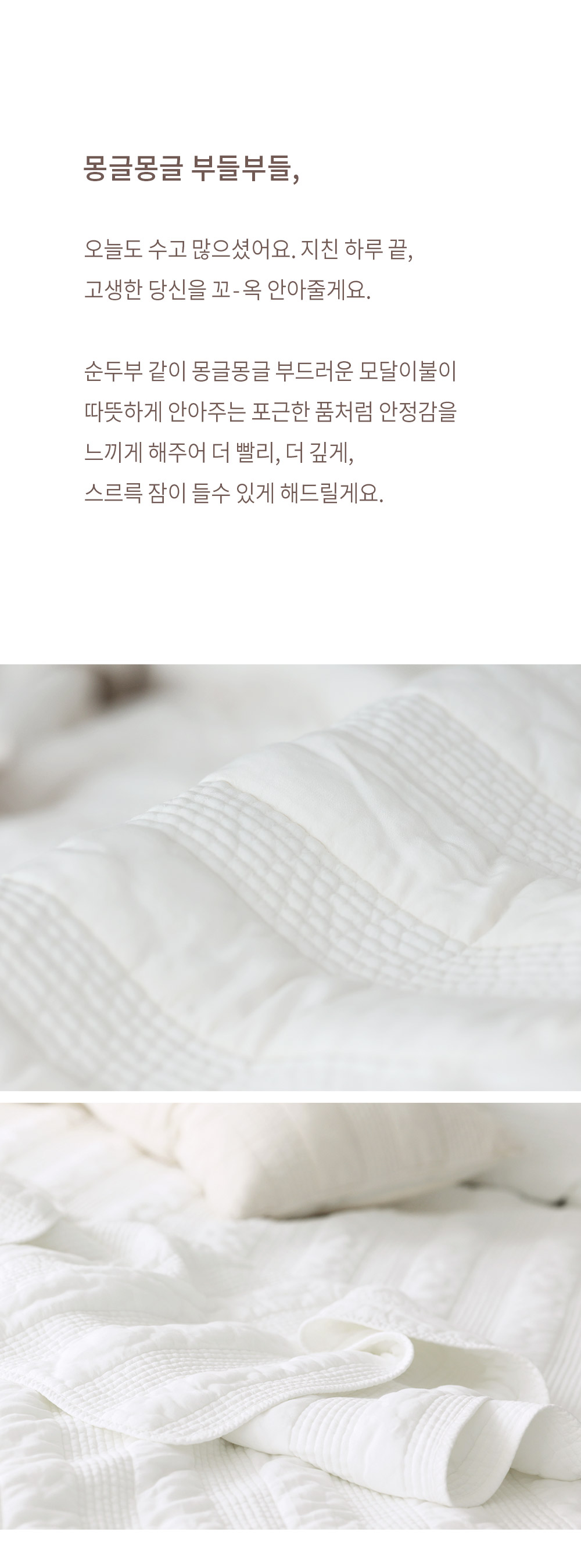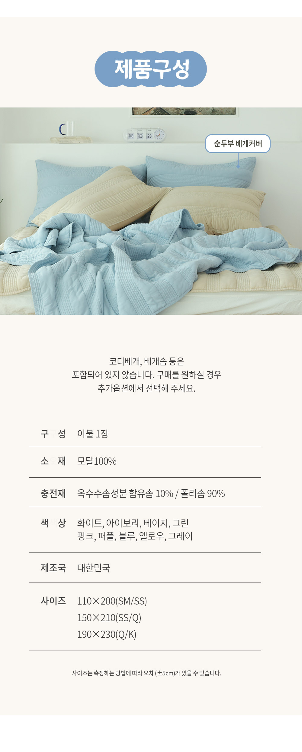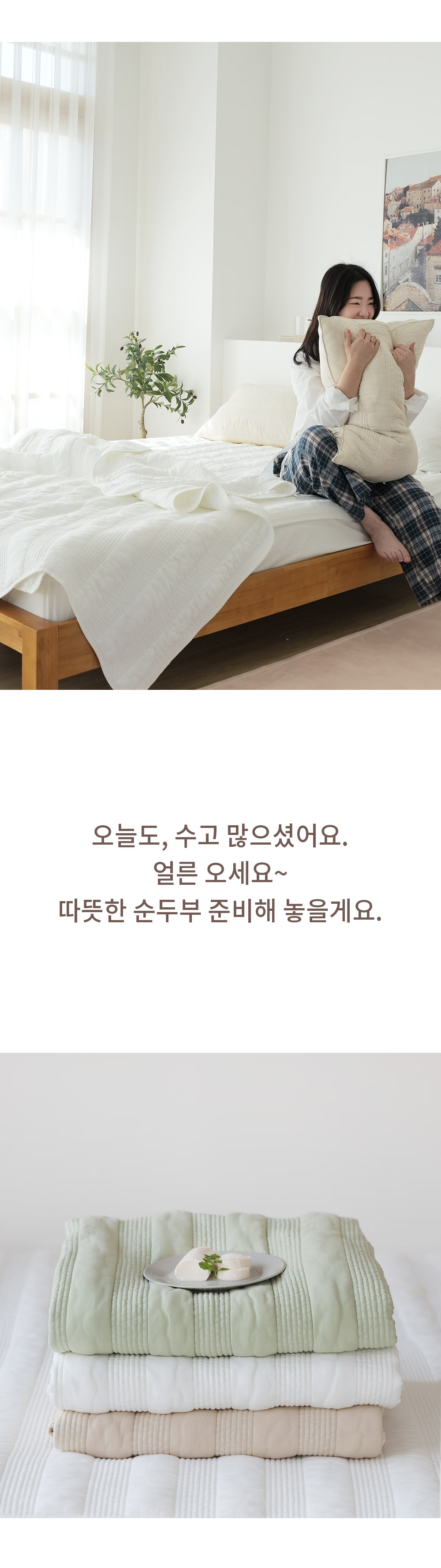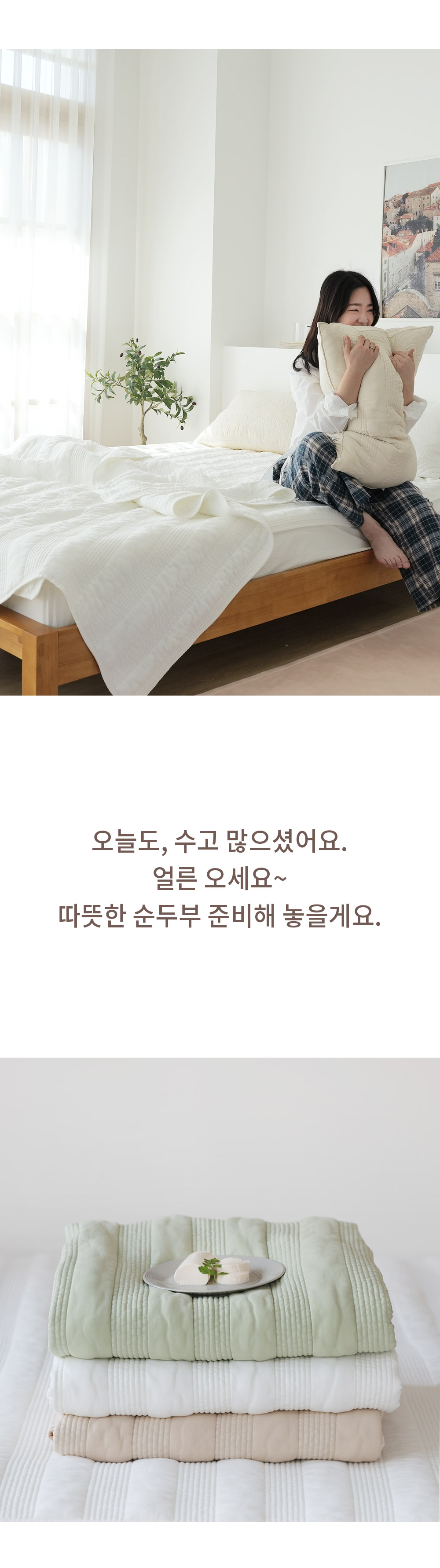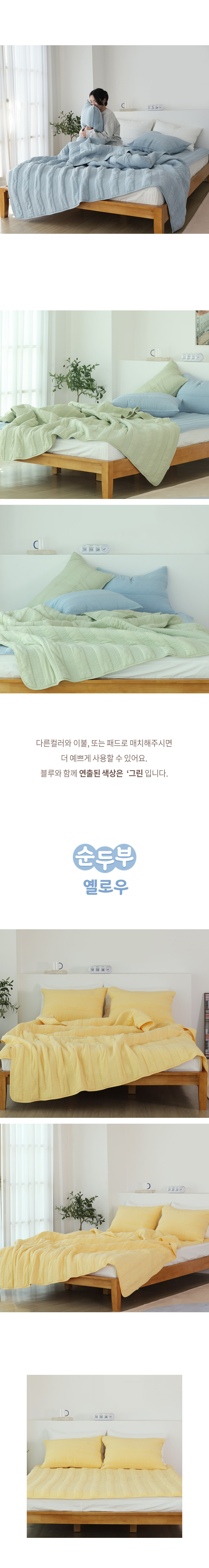 | 치수 | 순두부 스프레드 이불 SM/SS (110cm*200cm/1kg) 순두부 스프레드 이불 SS/Q (150cm*210cm/1.65kg) 순두부 스프레드 이불 Q/K (190cm*230cm/2.32kg) 순두부 스프레드 이불 SM/SS (패드용 밴드추가) (110cm*200cm/1kg) 순두부 스프레드 이불 SS/Q (패드용 밴드추가) (150cm*210cm/1.65kg) 순두부 스프레드 이불 Q/K (패드용 밴드추가) (190cm*230cm/2.32kg) 순두부 스프레드 베개커버 (50cm*70cm) |