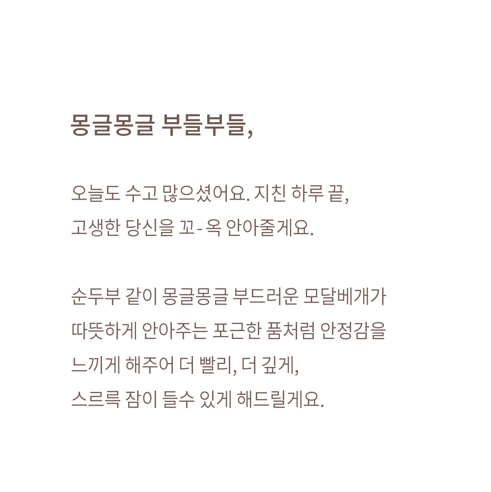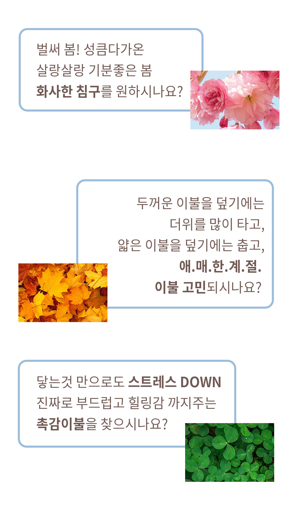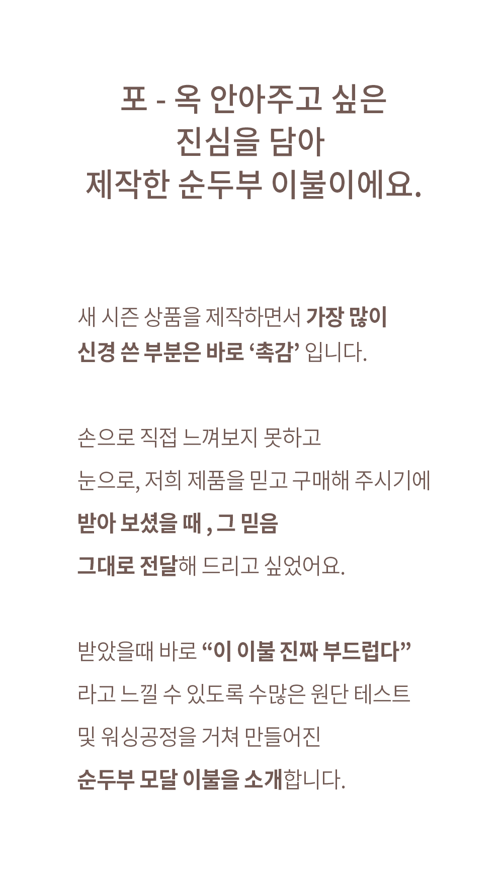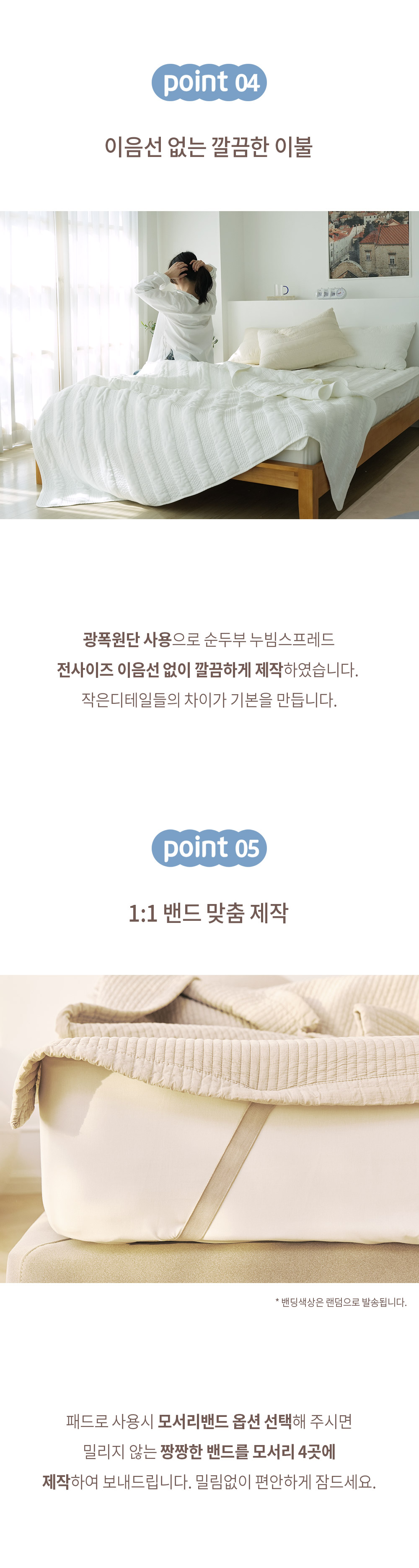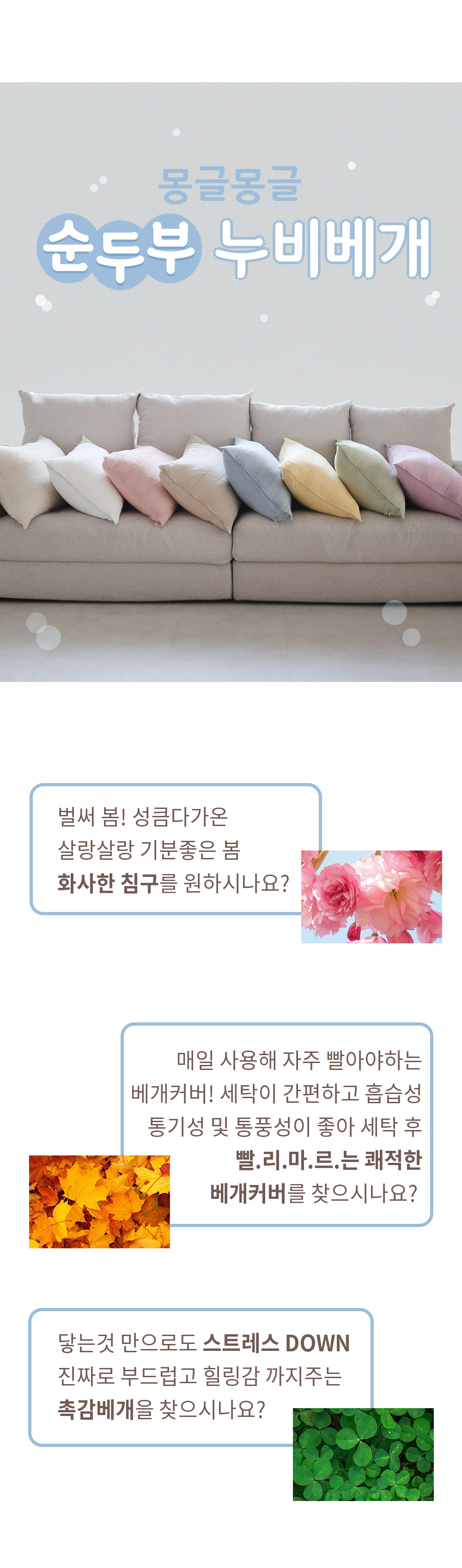 | 치수 | 순두부 스프레드 이불 SM/SS (110cm*200cm/1kg) 순두부 스프레드 이불 SS/Q (150cm*210cm/1.65kg) 순두부 스프레드 이불 Q/K (190cm*230cm/2.32kg) 순두부 스프레드 이불 SM/SS (패드용 밴드추가) (110cm*200cm/1kg) 순두부 스프레드 이불 SS/Q (패드용 밴드추가) (150cm*210cm/1.65kg) 순두부 스프레드 이불 Q/K (패드용 밴드추가) (190cm*230cm/2.32kg) 순두부 스프레드 베개커버 (50cm*70cm) |