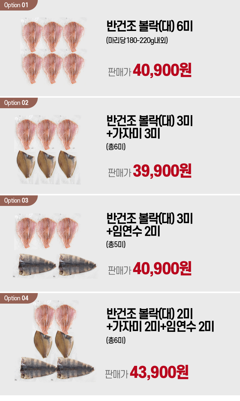 | 상품구성 | ●반건조 볼락(대) 6미(마리당180-220g내외) ●반건조 볼락(대) 3미+가자미 3미(총6미) ●반건조 볼락(대) 3미+임연수 2미(총5미) ●반건조 볼락(대) 2미+가자미 2미+임연수 2미(총6미) |