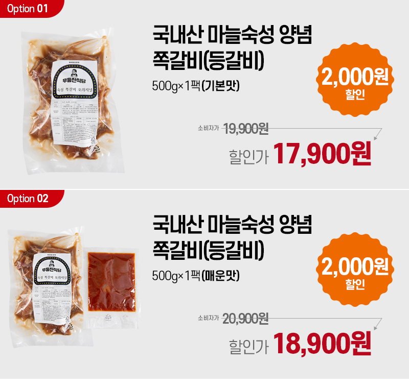| 포장단위별 내용물의 용량(중량), 수량 | 마늘숙성 쪽갈비 - 500g, 매콤쪽갈비 - 580g(소스포함) |