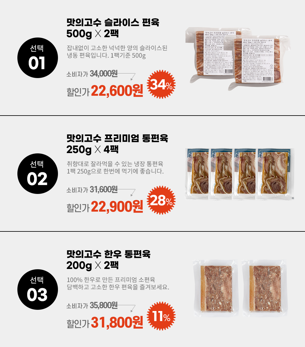 | 제품명 | 슬라이스 편육 / 냉장 통편육 / 한우 통편육 |