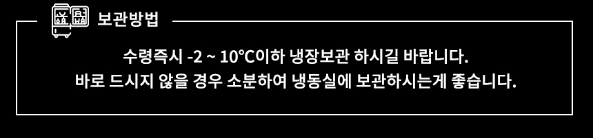 | 보관방법 또는 취급방법 | 수량즉시 -2~10℃이하 냉장보관 하시길 바랍니다. 바로 드시지 않을 경우 소분하여 냉동실에 보관하시는게 좋습니다. |