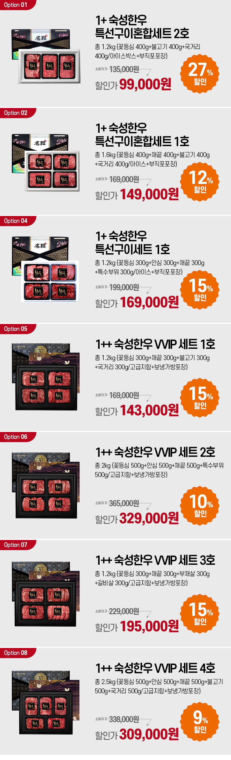 | 포장단위별 내용물의 용량(중량), 수량, 크기 | 1+ 숙성한우 특선구이혼합세트 2호(총 1.2kg/꽃등심 400g+불고기 400g+국거리 400g) 1+ 숙성한우 특선구이혼합세트 1호(총 1.6kg/꽃등심 400g+채끝 400g+불고기 400g+국거리 400g) 1+ 숙성한우 특선구이세트 7호(총 1kg/꽃등심 400g×2팩+채끝 200g) 1+ 숙성한우 특선구이세트 1호(총 1.2kg/꽃등심 300g+안심 300g+채끝 300g+특수부위 300g) 1++ 숙성한우 VVIP 세트 1호-(총 1.2kg/꽃등심 300g+채끝 300g+불고기 300g+국거리 300g) 1++ 숙성한우 VVIP 세트 2호-(총 2kg/꽃등심 500g+안심 500g+채끝 500g+특수부위 500g) 1++ 숙성한우 VVIP 세트 3호-(총 1.2kg/꽃등심 300g+채끝 300g+부채살 300g+갈비살 300g) 1++ 숙성한우 VVIP 세트 4호-(총 2.5kg/꽃등심 500g+안심 500g+채끝 500g+불고기 500g+국거리 500g) |