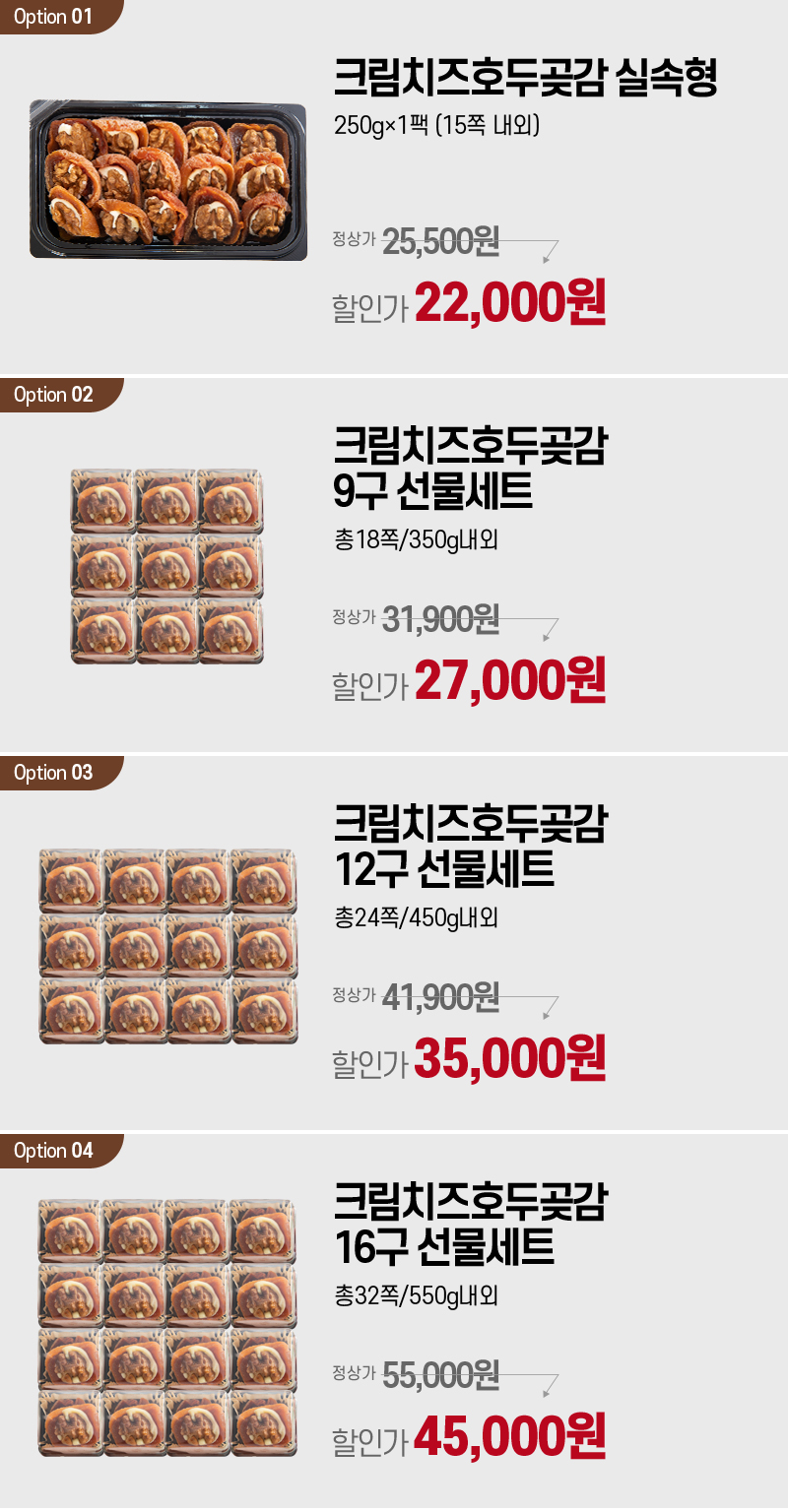 | 포장단위별 내용물의 용량(중량), 수량, 크기 | 크림치즈호두곶감 실속형 250g×1팩 (15쪽 내외) 크림치즈호두곶감 9구 선물세트 - 총18쪽/350g내외 크림치즈호두곶감 12구 선물세트 - 총24쪽/450g내외 크림치즈호두곶감 16구 선물세트 - 총32쪽/600g내외 |