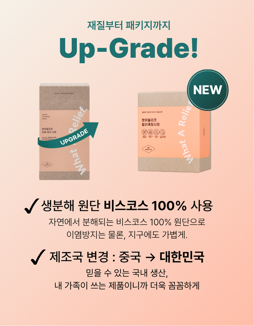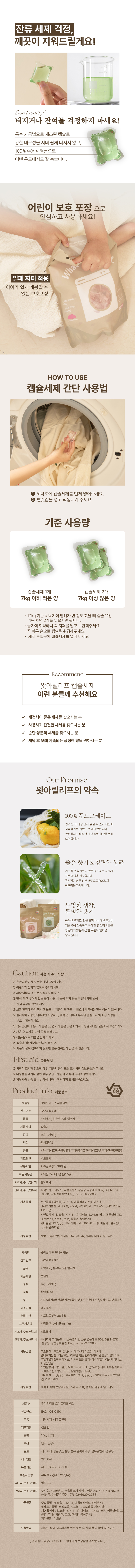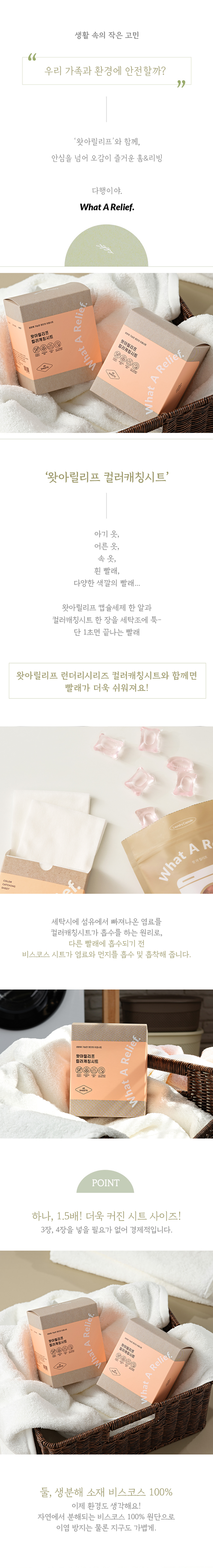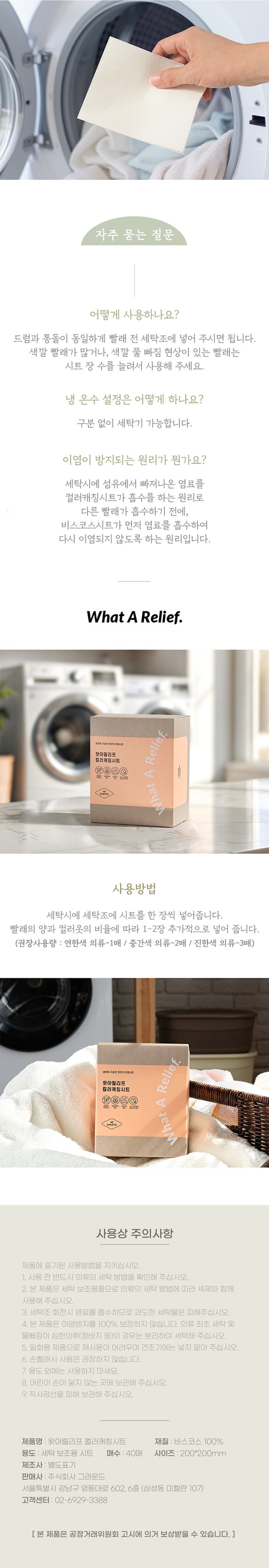 | 용도 및 제형 | 세탁세체-섬유용, 캡슐형,왓아릴리프 컬러캐칭시트 -시트형 |