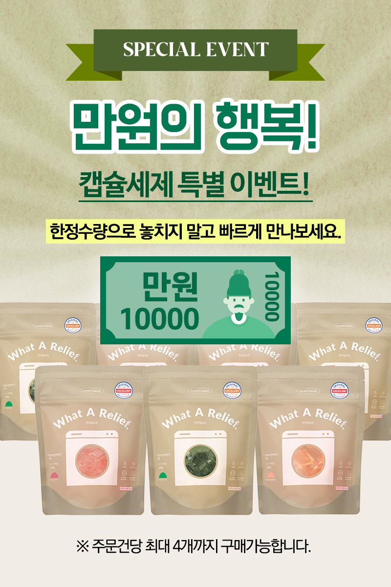 | 중량 · 용량 · 매수 · 크기 | 왓아릴리프 올인원 캡슐세제 : 420(14gx30개입) 왓아릴리프 컬러캐칭시트 : 사이즈 200*200mm (40개입) |