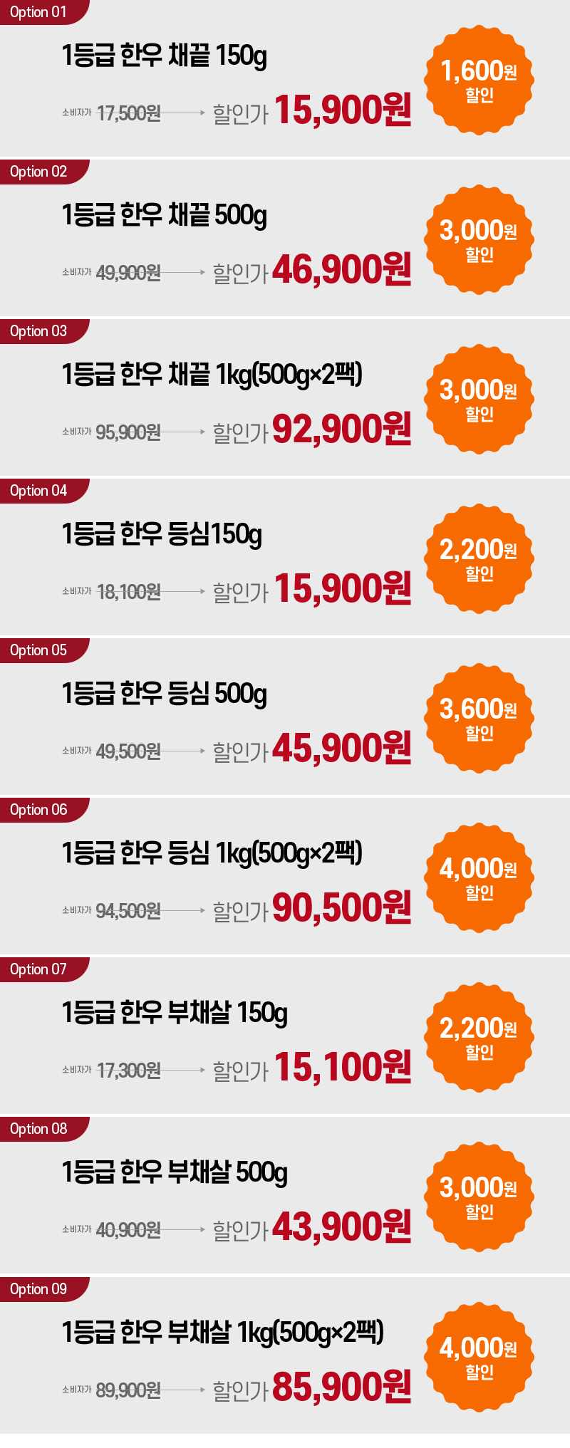 | 상품구성 | 1등급 한우 채끝/등심/부채살 (150g/500g/1kg) |