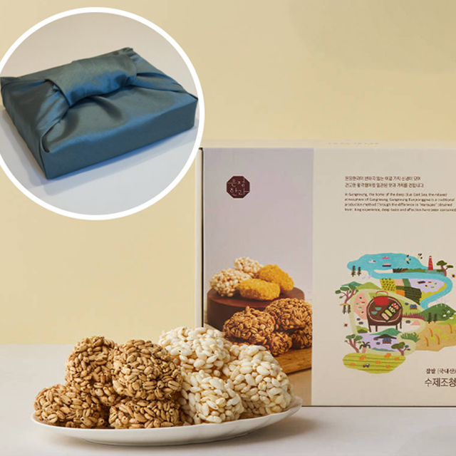 - home > 간식/음료/양념 > 떡/빵/과자/스낵 > 베이커리/과자/떡/스낵 > 강릉은정한과 한입과줄 선물세트(총10구/보리5구+통밥5구)+박스+보자기포장