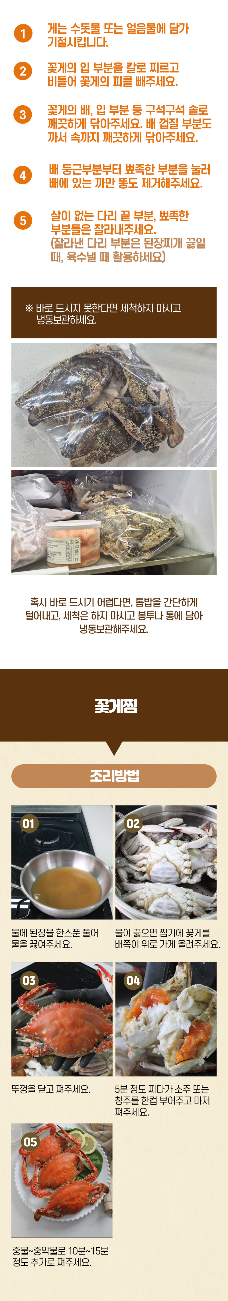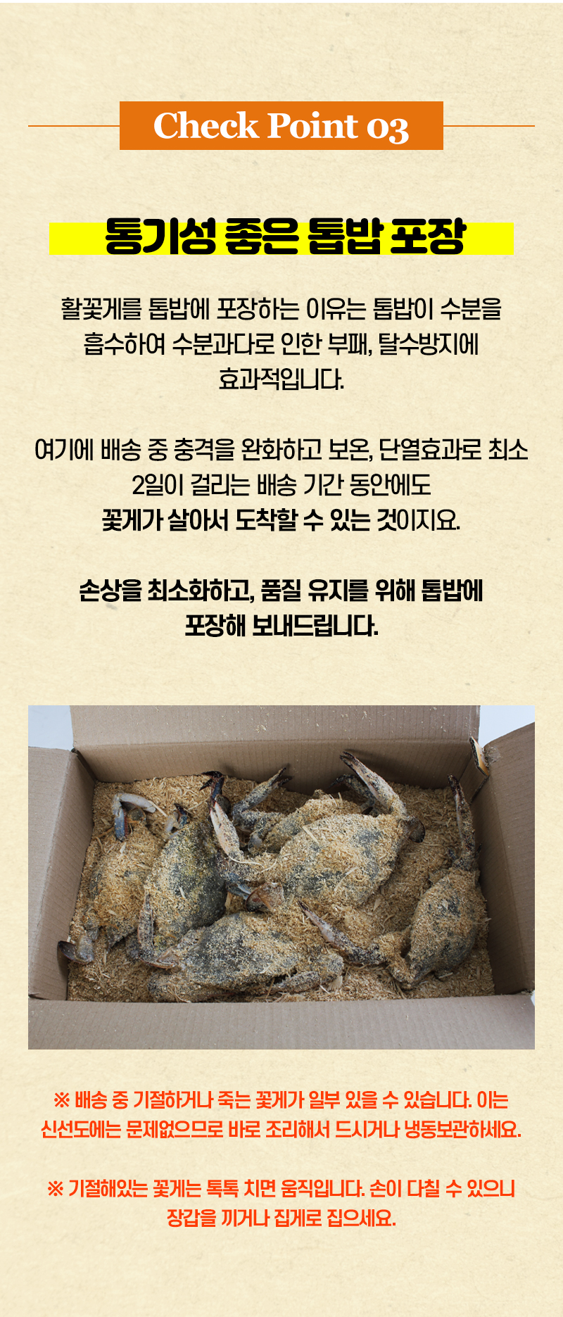 제조년월일, 소비기한 또는 품질유지기한 당일 조업한 활꽃게로 출고 / 수산물로 정확한 유통기한 표기가 어렵습니다. 수령 후 바로 조리해서 드시고, 바로 드시지 못하실 경우 냉동보관 하시기 바랍니다.