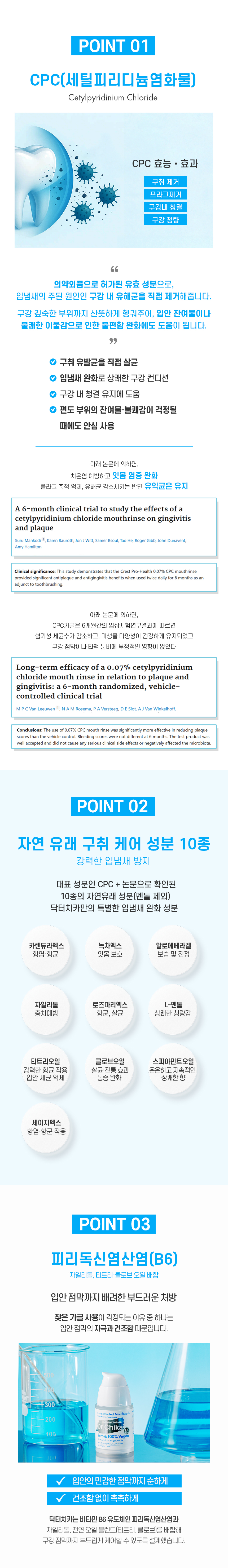 | 제품에 사용된 화학물질 명칭 | 세틸피리디늄염화,벤조산나트륨,농글리 세린,피리독신염산염,시트르산,시트르산 나트륨폴리옥시에틸렌경화피마자유,자일 리톨,사카린나트륨,로즈마리엑스,세이지 엑스,카렌듀라엑스,알로에엑스,녹차엑스, 알로에베라겔,L-멘톨,티트리오일,클로브 오일,스피아민트오일,향료,정제수 |