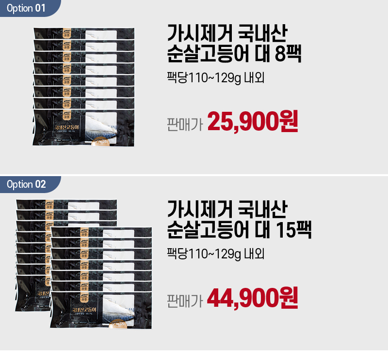 포장단위별 내용물의 용량(중량), 수량 | 가시제거 국내산 순살고등어 대 8팩(팩당110-129g내외) / 가시제거 국내산 순살고등어 대 15팩(팩당110-129g내외) |