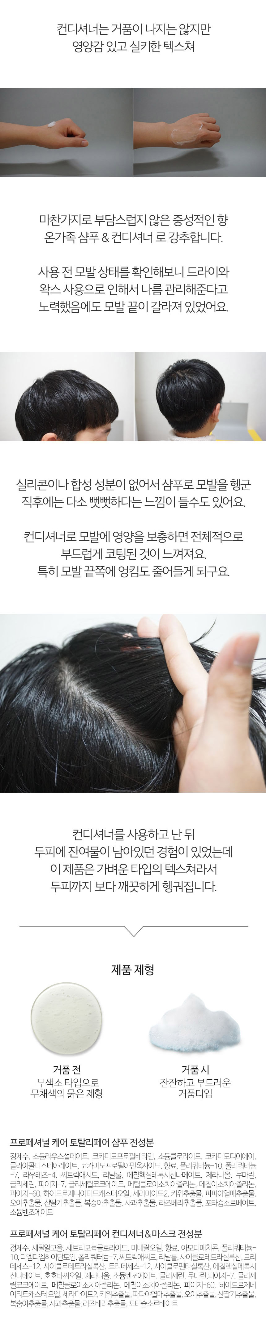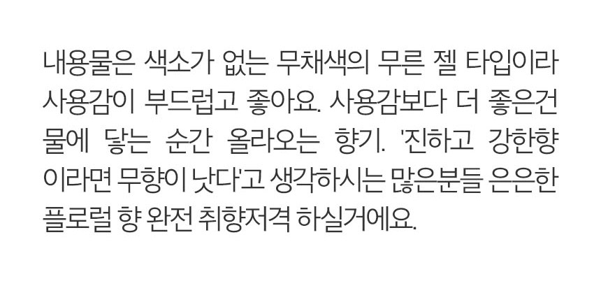 | 모든 원료성분 | 바디로션 정제수, 우레아, 알로에베라잎즙, 미네랄오일, 세테아릴알코올, 글리세린, 시어버터, 글리세릴스테아레이트, 피이지-100, 스테 아레이트, 귀리추출물, 판테놀, 라우레스-9, 향료, 시트릭 애씨드, 아크릴레이트/C10-30알킬아크릴레이트크로스폴리머, 클로 페네신, 토코페릴아세테이트, 트라이에탄올아민 ,테트라소듐이 디티에이, 포타슘솔베이트, 소듐벤조에이트, 귀리커넬 추출물, 레시틴, 카르니틴, 트라이소듐이디티에이, 유비퀴논, 토코페롤 바디밀크 정제수, 소듐라우레스설페이트, 피이지-4레이프씨드아마이드, 소듐코코암포아세테이트, 코카미도프로필베타인,마그네슘클로 라이드, 피이지-7, 글리세릴코코에이트, 향료, 글리세린, 락틱애씨드, 멘톨, 소듐클로라이드, 알로에베라잎즙,마그네슘 나이트레이트, 메칠클로로이소치아졸리논,메칠이소치아졸리논, 포타슘소르베이트, 소듐벤조에이트, 소듐글라이콜레이트 샤워젤 정제수, 우레아, 소듐라우레스설페이트, 코카미도프로필베타인, 피이지-4레이프씨드아마이드 데실글루코사이드, 피이지-7 글리세릴코코에이트, 글리세린,스타이렌/아크릴레이트코폴리머 향료, 마그네슘클로라이드, 시트릭애씨드, 코코-글루코사이드, 판테놀, 벤조익애씨드, 마그네슘나이트레이트, 메칠클로로이소 치아졸리논, 메칠이소치아졸리논, 귀리커넬추출물, 포타슘 솔베이트, 소듐벤조에이트 여성청결제 정제수, 우레아, 알로에베라잎즙, 미네랄오일, 세테아릴알코올, 글리세린, 글리세릴스테아레이트, 피이지-100스테아레이트, 시어버터, 페녹시에탄올, 라우레스-9, 판테놀, 향료, 시트릭 애씨드, 아크릴레이트/C10-30알킬아크릴레이트크로스폴리머, 클로페네신, 토코페릴아세테이트, 트라이에탄올아민테트라소듐 이디티에이, 포타슘솔베이트, 소듐벤조에이트, 귀리커넬추출물, 레시틴, 카르니틴, 트라이소듐이디 티에이, 유비퀴논, 토코페롤 핸드크림 정제수, 우레아, 알로에베라잎즙, 세테아릴알코올, 이소프로필 팔미테이트, 글리세릴모노스테아레이트, 글리세린, 세테아레스 -20, 프로필렌글라이콜, 페녹시에탄올, 세테아레스-12, 향료, 클로페네신, 트리에탄올아민, 아크릴레이트/C10-30 알킬아크 릴레이트크로스폴리머, 디포타슘이디티에이, 시트릭애씨드, 테트라소듐이디티에이, 귀리커넬추출물, 포타슘소르베이트, 소듐벤조에이트 샴푸 정제수, 소듐라우스설페이트, 코카미도프로필베타인, 소듐클로라이드, 코카미도디이에이, 글라이콜디스테아레이트, 코카미도프로필아민옥사이드, 향료, 폴리쿼터늄-10, 폴리쿼터늄 -7, 라우레즈-4, 씨트릭애시드, 리날룰, 에칠헥실테톡시신나메이트, 제라니올, 쿠마린, 글리세린, 피이지-7, 글리세릴코코에이트, 메틸클로이소치아졸리논, 메칠이소치아졸리논, 피이지-60, 하이드로제니이티드캐스터오일, 세라마이드2, 키위추출물, 파파야열매추출물, 오이추출물, 산딸기추출물, 복숭아추출물, 사과추출물, 라즈베리추출물, 포타슘소르베이트, 소듐벤조에이트 컨디셔너 정제수, 세틸알코올, 세트리모늄클로라이드, 미네랄오일, 향료, 아모디메치콘, 폴리쿼터늄- 10, 디엠디엠하이단토인, 폴리쿼터늄-7, 씨트릭애씨드, 리날룰, 사이클로테트라실록산, 트리 데세스-12, 사이클로테트라실록산, 트리데세스-12, 사이클로펜타실록산, 에칠헥실메톡시 신나베이트, 호호바씨오일, 제라니올, 소듐벤조에이트, 글리세린, 쿠마린, 피이지-7, 글리세 릴코코에이트, 메칠클로이소치아졸리논, 메칠이소치아졸리논, 피이지-60, 하이드로제네, 이티트캐스터오일, 세라마이드2, 키위추출물, 파파야열매추출물, 오이추출물, 산딸기추출물, 복숭아추출물, 사과추출물, 라즈베리추출물, 포타슘소르베이트 헤어팩 정제수, 세틸알코올, 파라피늄 리퀴, 세트리모늄클로라이드, 호호바오일, 세라마이드2, 밀 배아 오일, 파파야열매추출물, 오이추출물, 사과추출물, 복숭아추출물, 딸기추출물, 키위 추출물, 라즈베리추출물, 아모디메티콘, 폴리쿼터늄-10, 글리세린, 폴리쿼터늄-7, PEG-7, 글리세릴코코에이트, 옥틸메톡시신나메이트, PEG-60, 수소첨가피마자오일, 프로필렌 글라이콜, 향료, 스테아라민, 트리데세스-12, BHT, 시트릭 에시드, PEG-20 , 피마자유, 소듐벤조에이트, 포타슘소르베이트, 메틸아이소싸이아졸리논, 메칠클로로이소치아졸리논, 리날로올 |