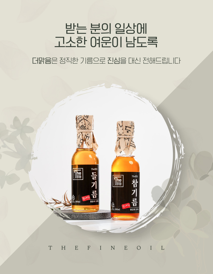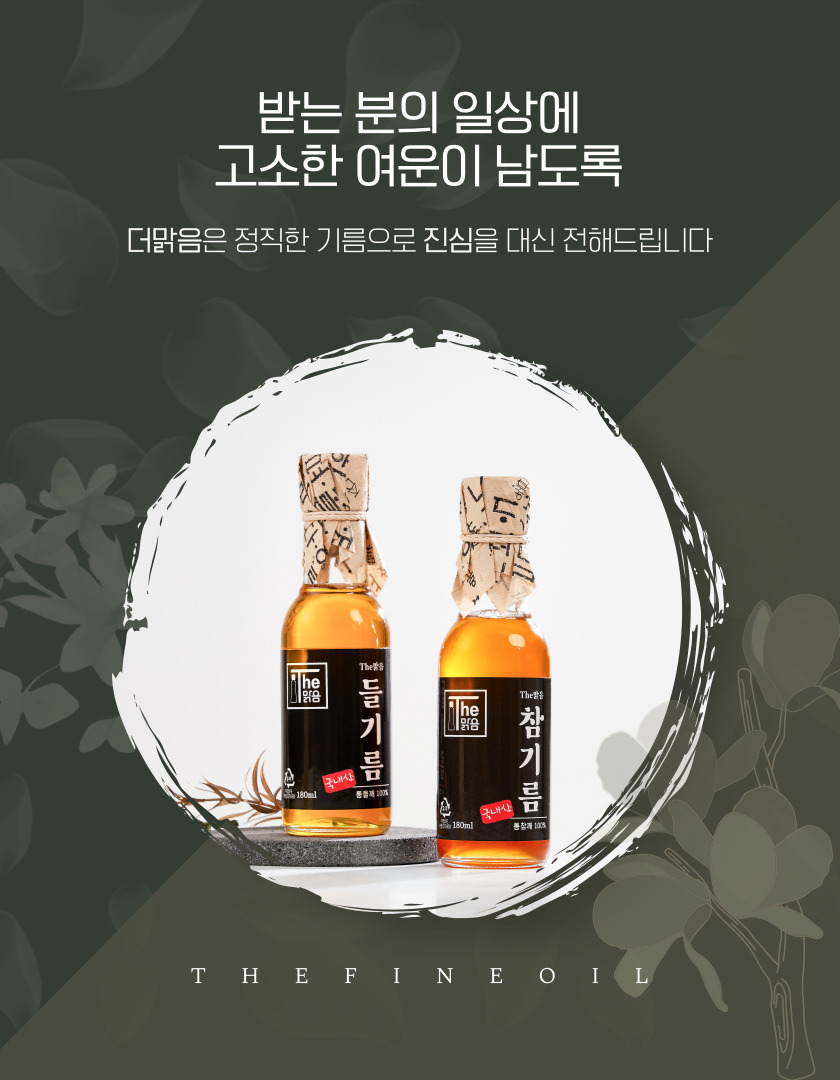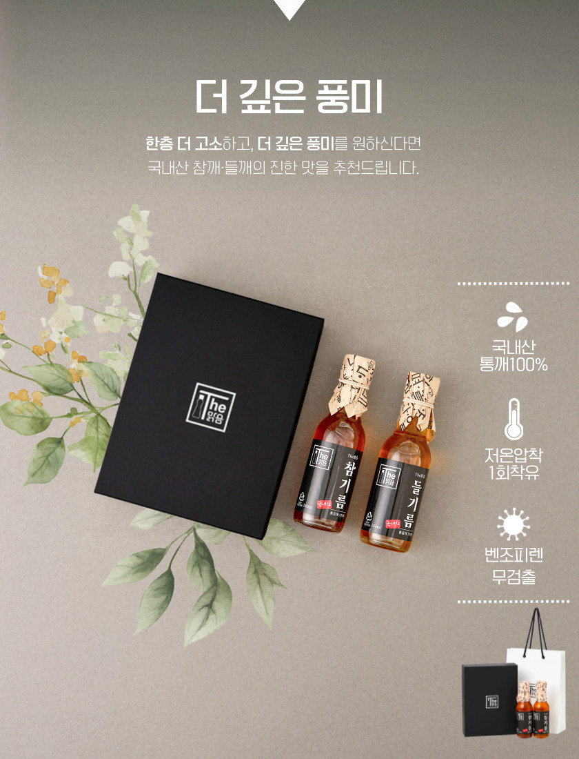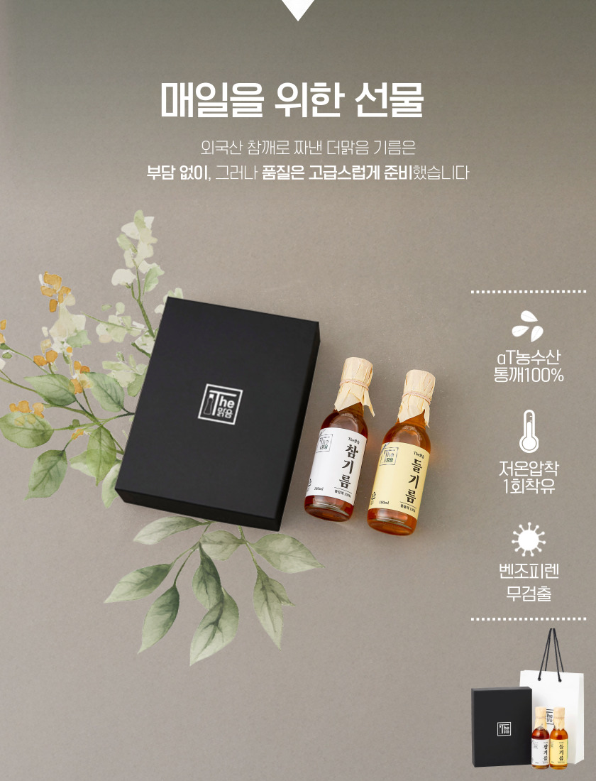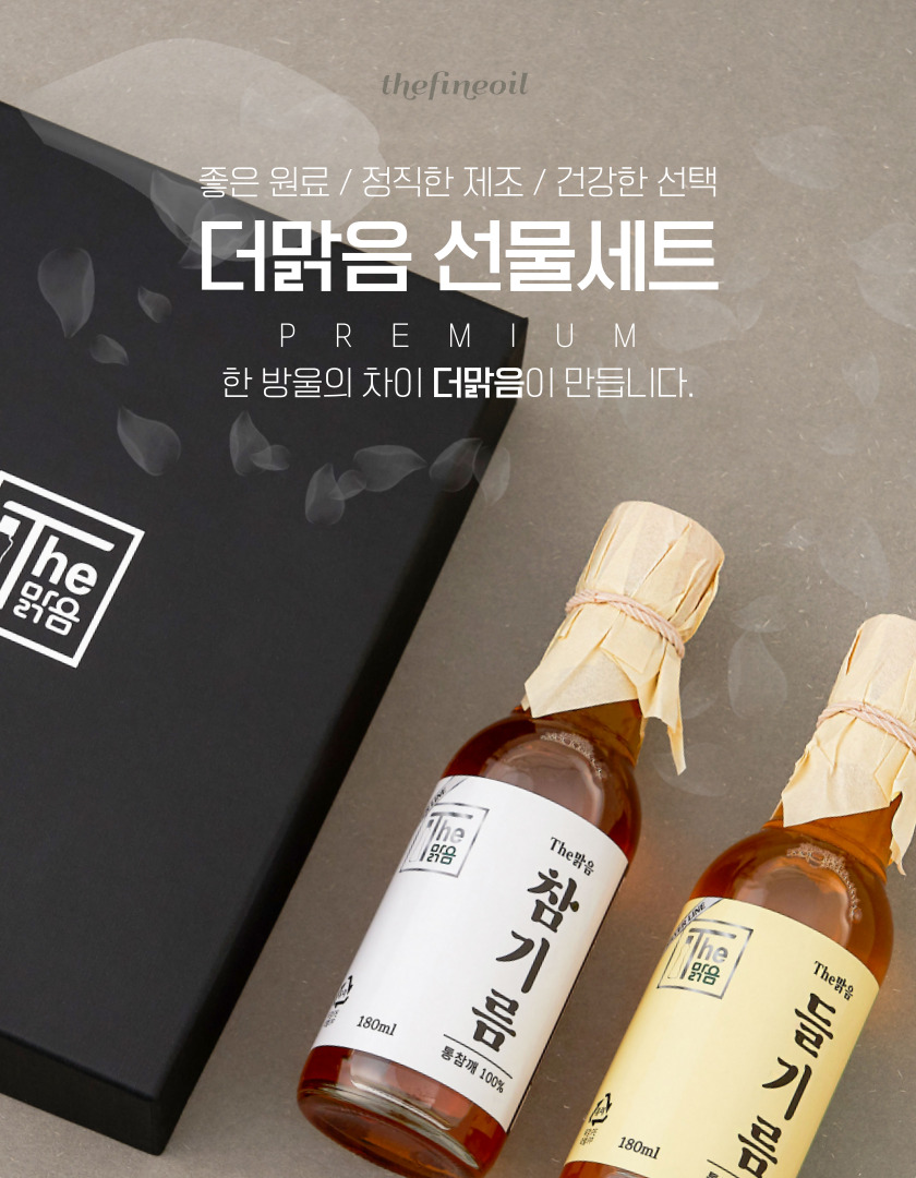 home > 간식/음료/양념 > 면/잼/양념/오일 > 잼/오일/소스/장류 > The맑음 1회만 착유하는 저온압착 참기름/들기름 선물세트+쇼핑백