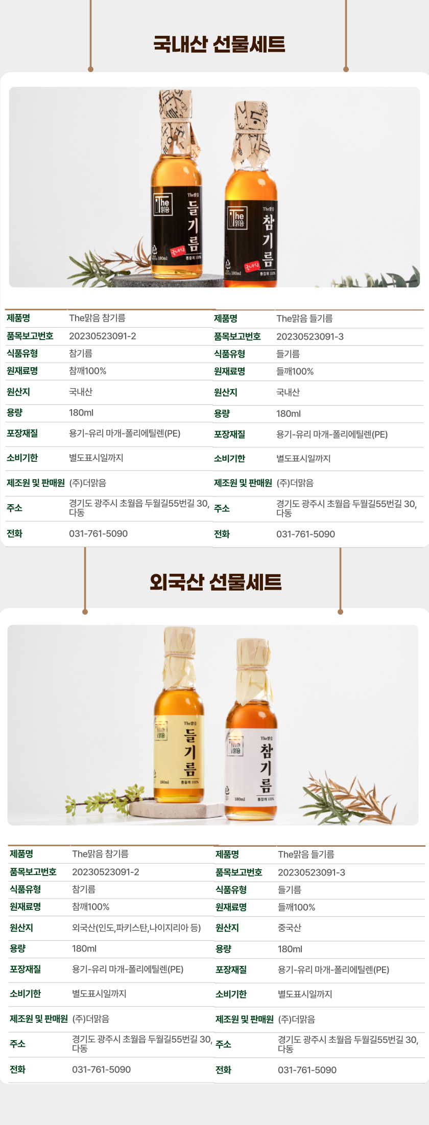 원재료명 및 함량 참기름: 참깨100% / 들기름: 들깨100%
