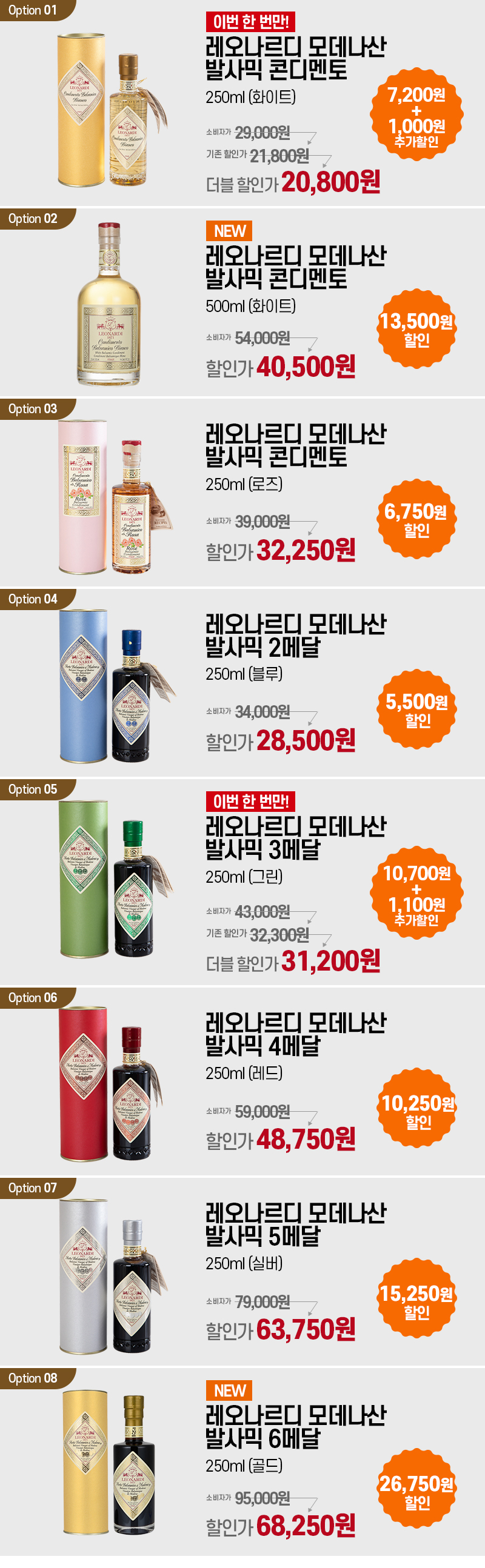 | 원재료명 및 함량 | 화이트 발사믹 콘디멘토:화이트와인식초55%(백포도주,무수아황산[산화방지제]),포도농축액45%(포도100%) 로즈 발사믹 콘디멘토:와인식초51.9%(백포도주,무수아황산[산화방지제]),포도농축액47.9%(배합함량포도100%) 블루 2메달:포도농축액55%(포도100%),와인식초45%(포도주,무수아황산[산화방지제]) 그린 3메달:포도농축액60%(포도100%),와인식초40%(포도주,무수아황산[산화방지제]) 레드 4메달:포도농축액65%(포도100%),와인식초35%(포도주,무수아황산[산화방지제]) 실버 5메달:포도농축액70%(포도100%),와인식초30%(포도주,무수아황산[산화방지제]) 골드 6메달: 포도농축액75%(배합함량포도100%),와인식초25%(포도주(무수아황산[산화방지제])) |