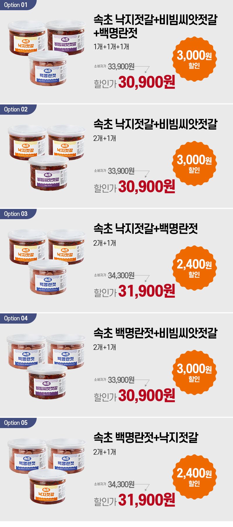 | 제품명 | 속초 낙지젓갈/비빔씨앗젓갈/백명란젓 220g 3개세트 |