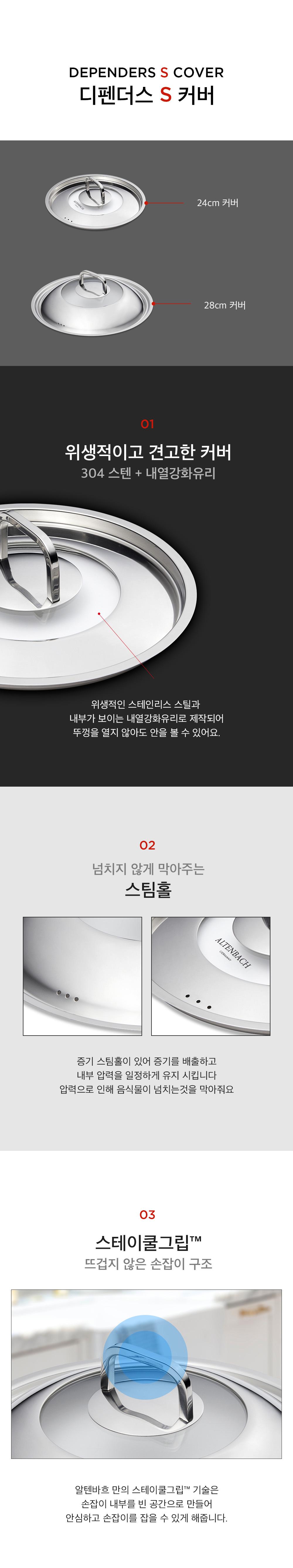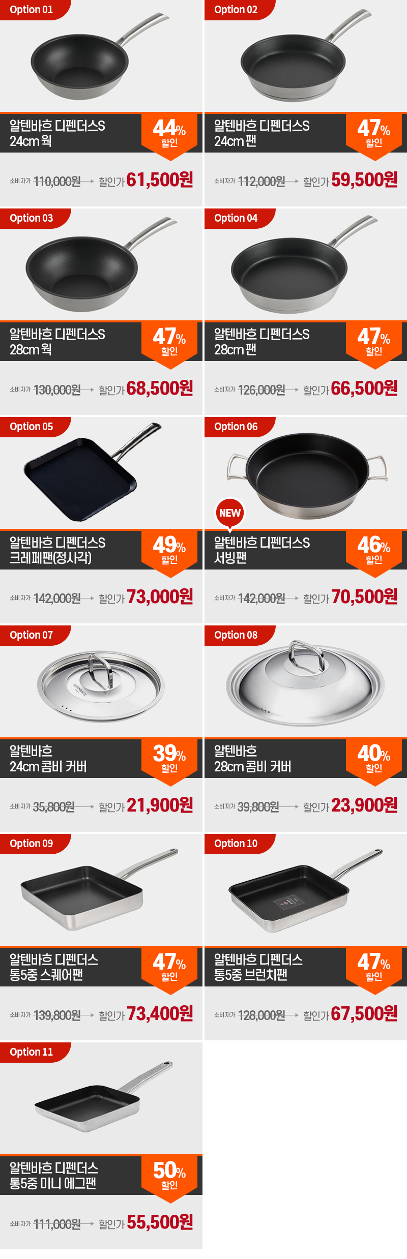 | 구성품 | 알텐바흐 디펜더스S 24cm 웍 알텐바흐 디펜더스S 24cm 팬 알텐바흐 디펜더스S 28cm 웍 알텐바흐 디펜더스S 28cm 팬 알텐바흐 디펜더스S 크레페팬(정사각) 알텐바흐 24cm 콤비 커버 알텐바흐 28cm 콤비 커버 알텐바흐 디펜더스 스퀘어팬 알텐바흐 디펜더스 브런치팬 알텐바흐 미니에그팬 알텐바흐 서빙팬 |