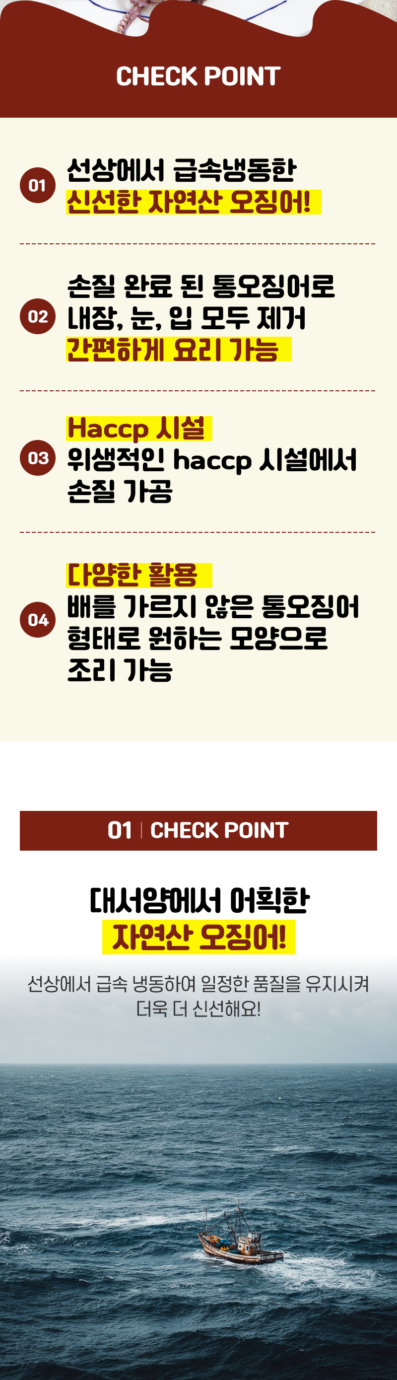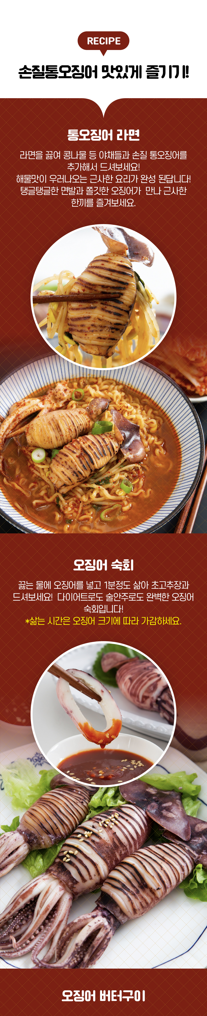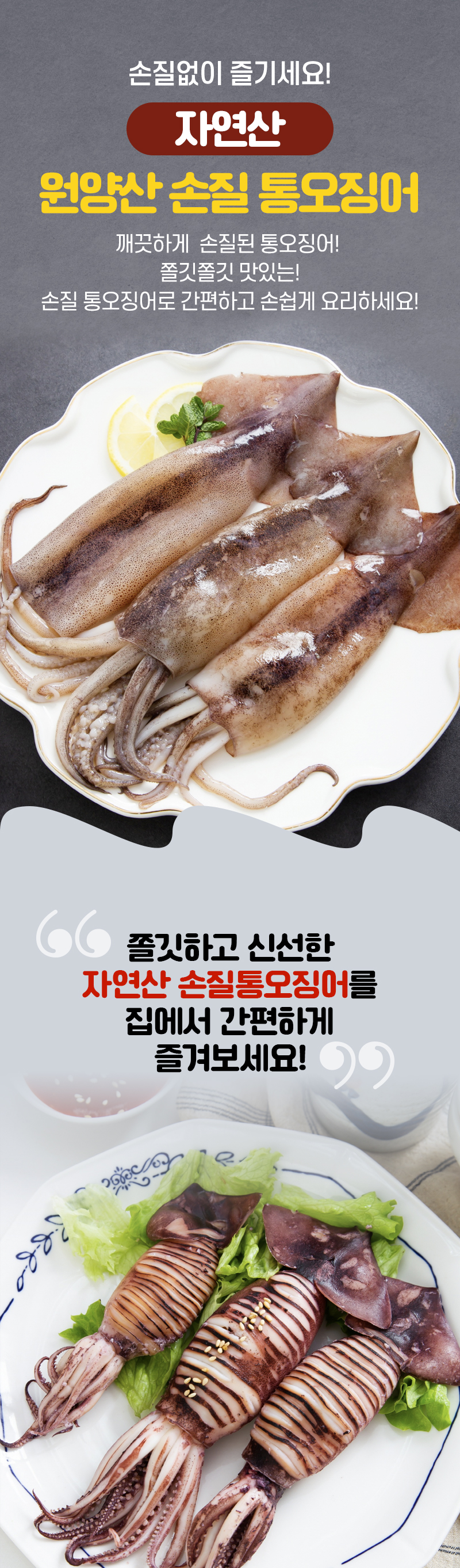 | 품목 또는 명칭 | 제품명: 자연산 손질 통 오징어 식품의유형: 기타수산물가공품 (가열하여 섭취하는 냉동식품) 품목보고번호: 2022070802949 |
