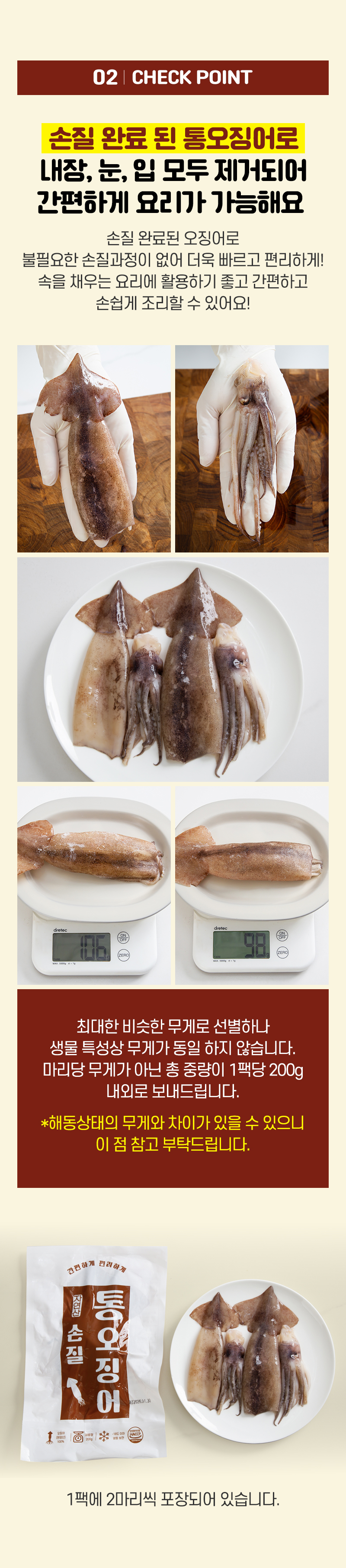| 상품구성 | 손질 통오징어 2마리x4팩 (팩당200g내외) 손질 통오징어 2마리x5팩 (팩당200g내외) 손질 통오징어 2마리x8팩 (팩당200g내외) 용기(포장)재질-내면: 폴리에틸렌 |