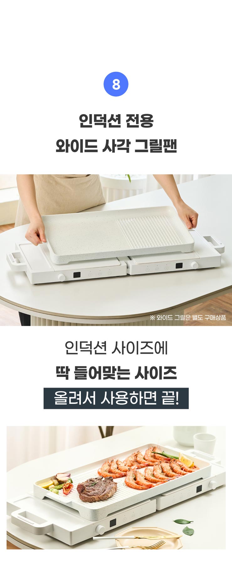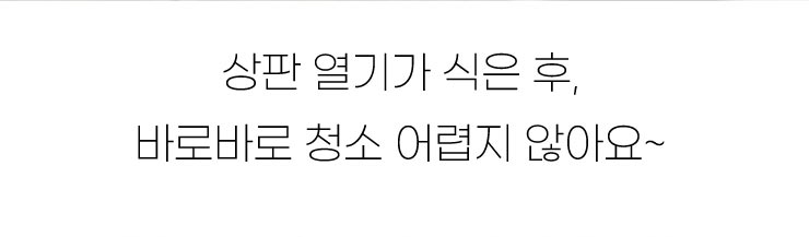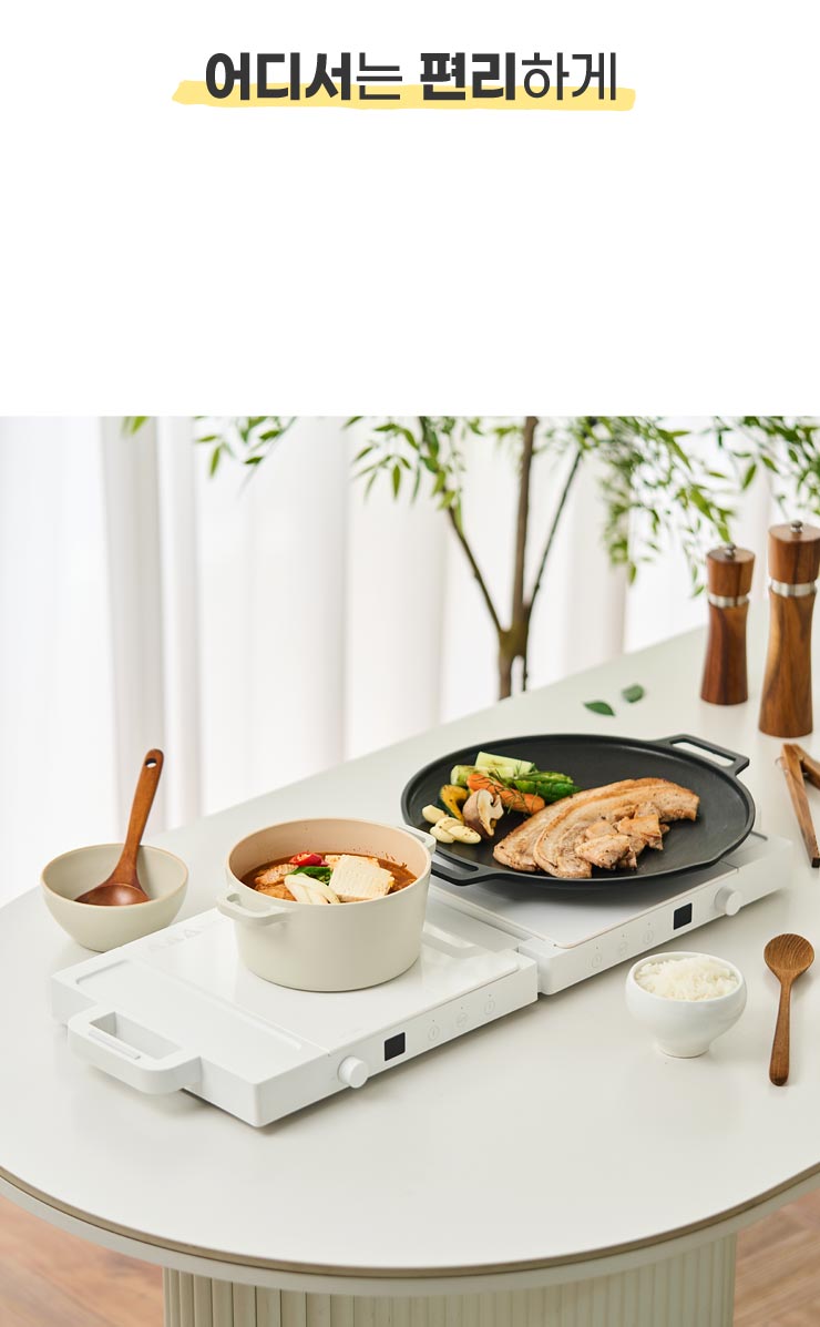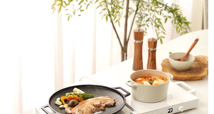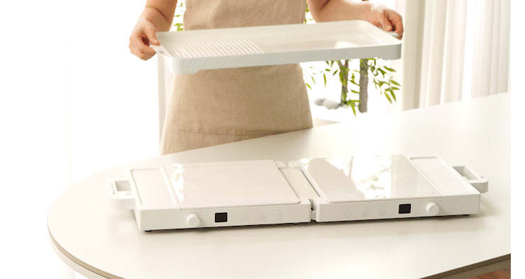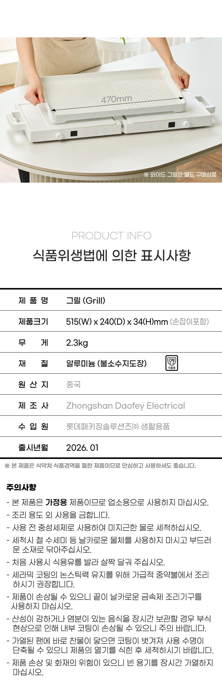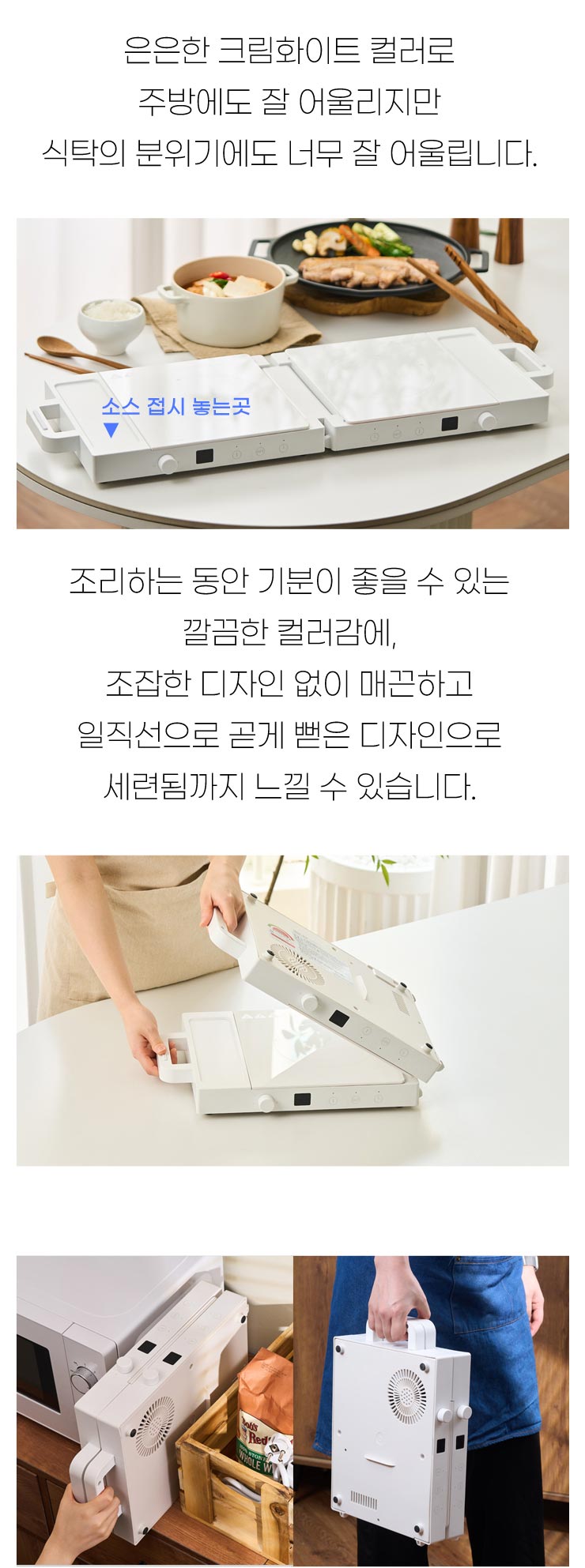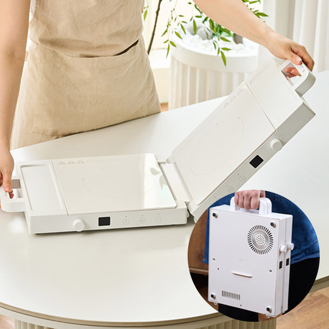 | 크기, 용량, 형태 | 제품크기: 367(W) x 268(D) x 95(H)mm (접은 상태) 제품크기: 728(W) x 268(D) x 47(H)mm (펼친 상태) 화구 크기: Ø145mm 무게: 3.5kg 구성품: 본품, 가방, 사각 전원케이블 줄 길이: 140cm 그릴 크기: 515(W) x 240(D) x 34(H)mm (손잡이 포함) 그릴 무게: 2.3kg 그릴 재질: 알루미늄 (불소수지도장) |