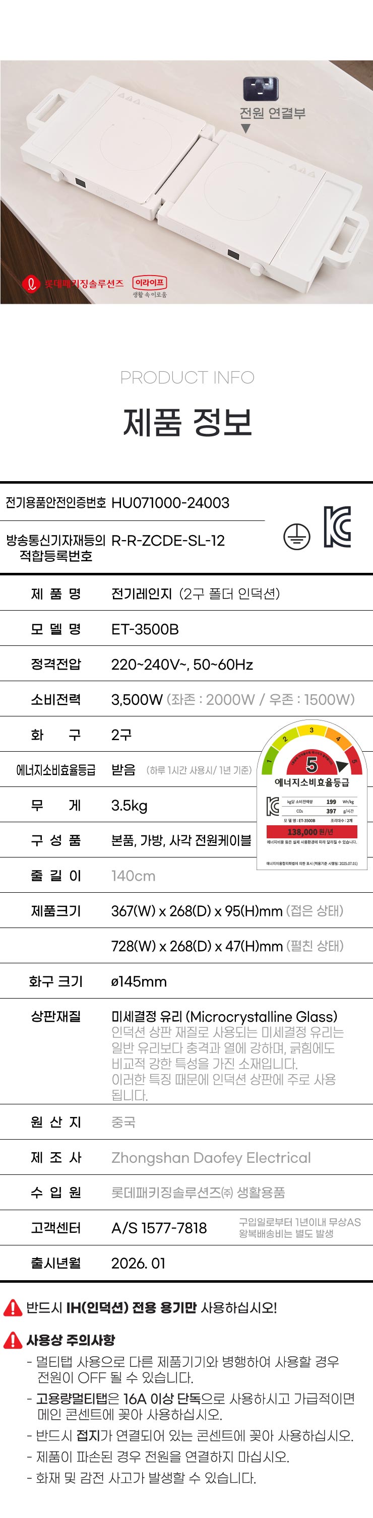 | 품명 및 모델명 | 전기레인지 (2구 폴더 인덕션) / ET-3500B 그릴 (Grill) |